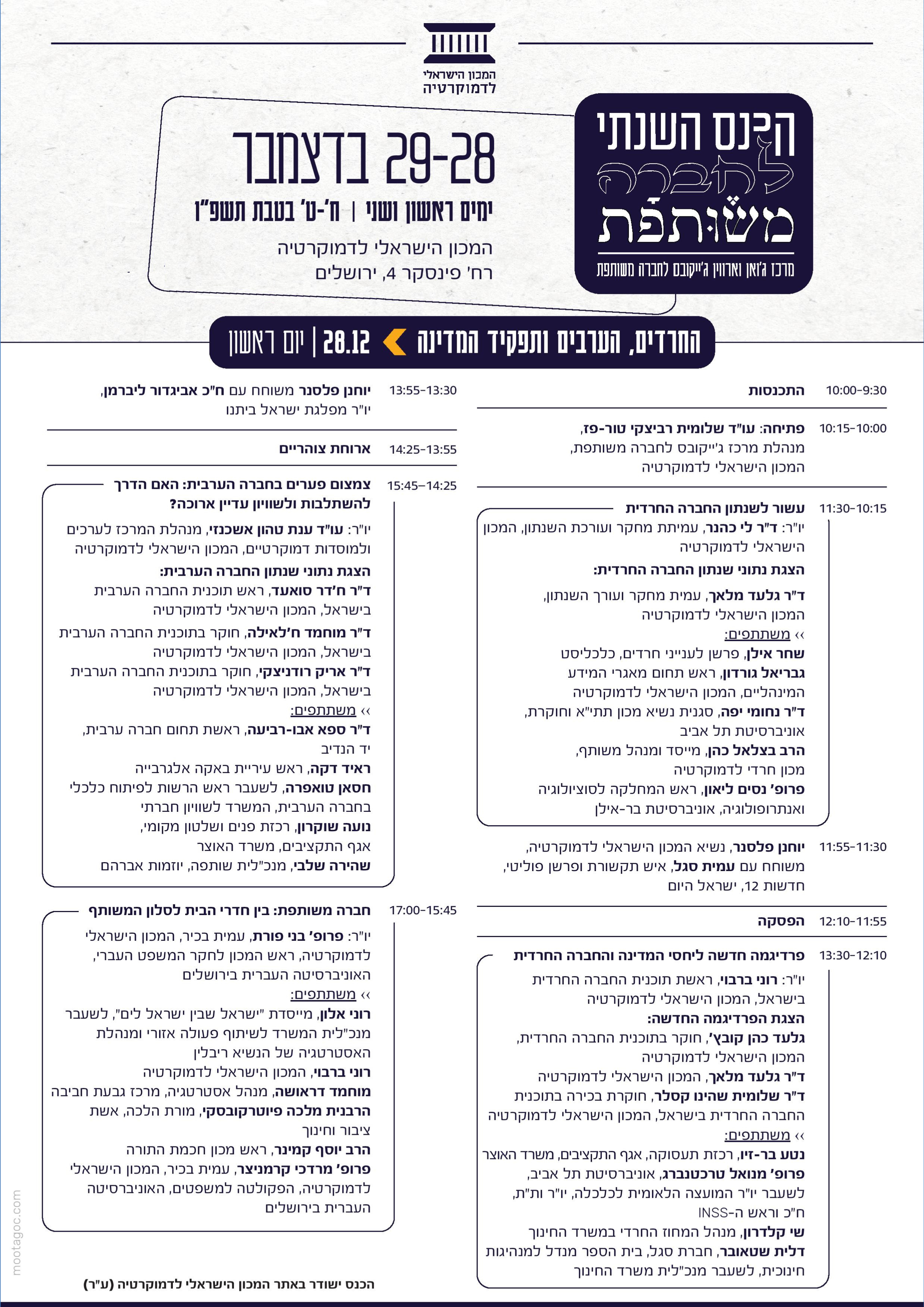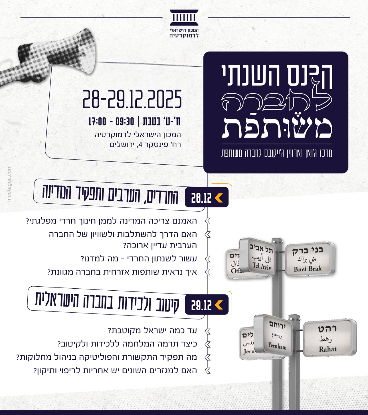 הכנס, שהתקיים בתאריכים 28-29.12.2025, ח'-ט' בטבת תשפ"ו, עסק בתמורות שחלו בחברה החרדית ובחברה הערבית, ביחסים בין כל אחת מהן לבין המדינה, ובעתיד החברה המשותפת בישראל. ניתן דגש מיוחד לקיטוב בחברה הישראלית, ובדרכים להתמודד איתו ולמתן אותו.