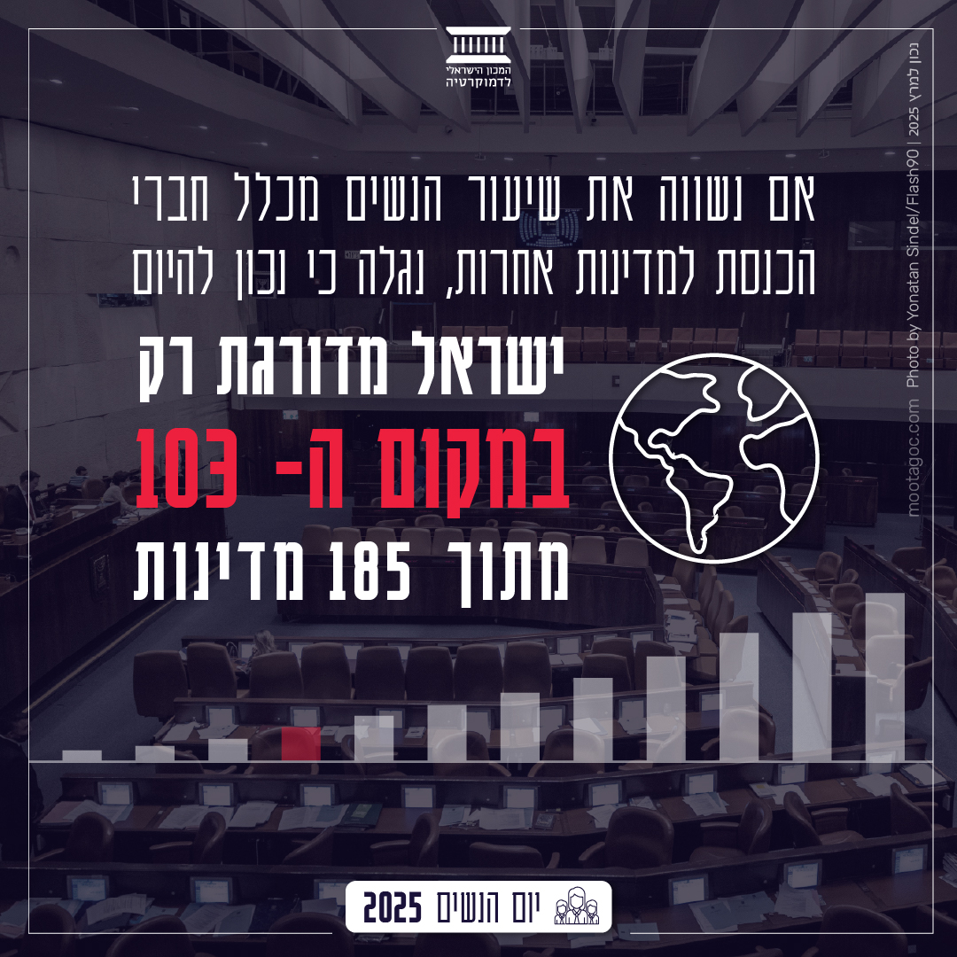 ישראל מדורגת היום במקום ה-103 מתוך 185 מדינות בייצוג נשים בפרלמנט, והפער בינה לבין ממוצע מדינות ה-OECD הולך וגדל. גם בממשלה הייצוג הנשי מדשדש, לעומת מגמות של שיפור מתמיד בדמוקרטיות בעולם