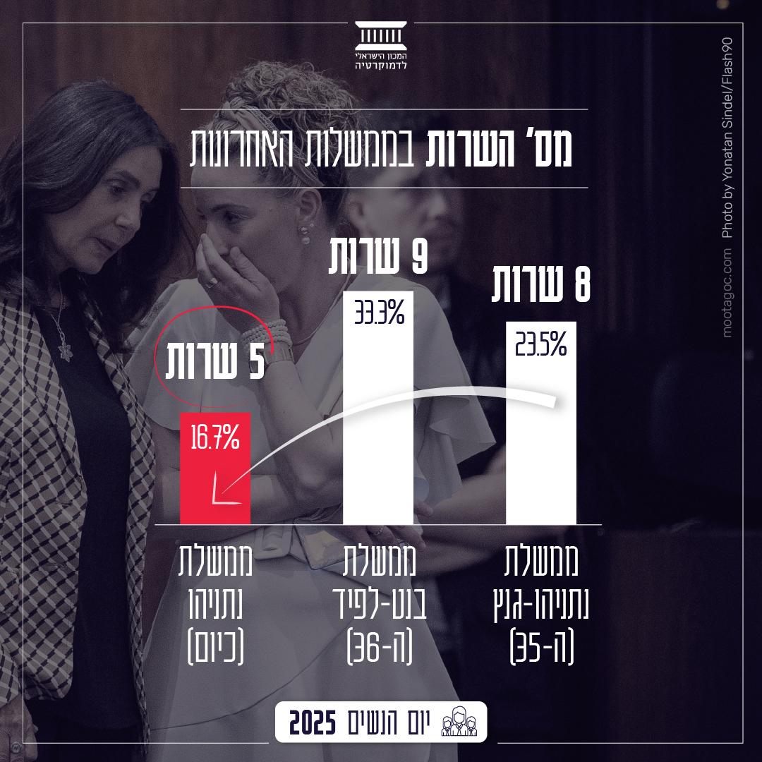שתי הממשלות הקודמות רשמו, כל אחת בתורה, רמות שיא חדשות של ייצוג נשי בממשלה. הממשלה ה-35 (ממשלת נתניהו-גנץ) שהוקמה לאחר בחירות 2020, כללה בראשית כהונתה מספר שיא של 8 נשים בתפקידי שר. מדובר היה בהכפלה של השיא הקודם. עד אז כיהנו בממשלה בנקודת זמן נתונה 4 נשים לכל היותר. הממשלה ה-36, ממשלת בנט-לפיד, שברה את השיא וכיהנו בה 9 נשים – שליש מכלל השרים. כפי שרואים בטבלה להלן, בממשלה הנוכחית יש נסיגה של ממש מרמות השיא הללו: נשים מאיישות רק 5 מתוך 30 חברי הממשלה, נכון להיום.