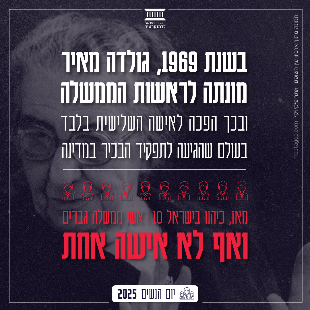 ישראל הייתה בין המדינות הראשונות שבהן הגיעה אישה לתפקיד הפוליטי הבכיר במדינה. זה קרה עוד בשנת 1969 כאשר גולדה מאיר מונתה לראשות הממשלה. היא הייתה האישה השלישית בלבד בעולם שהגיעה לתפקיד. אולם, מאז שעזבה מאיר את ראשות הממשלה ב-1974 כיהנו בישראל 10 ראשי ממשלה גברים ואף לא אישה אחת.