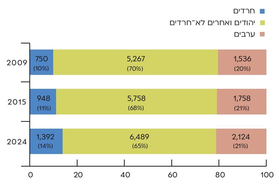 תרשים א/1 אוכלוסיית ישראל, לפי קבוצת אוכלוסייה, 2009, 2015 ו-2024 (במספרים מוחלטים [באלפים] וב-%)