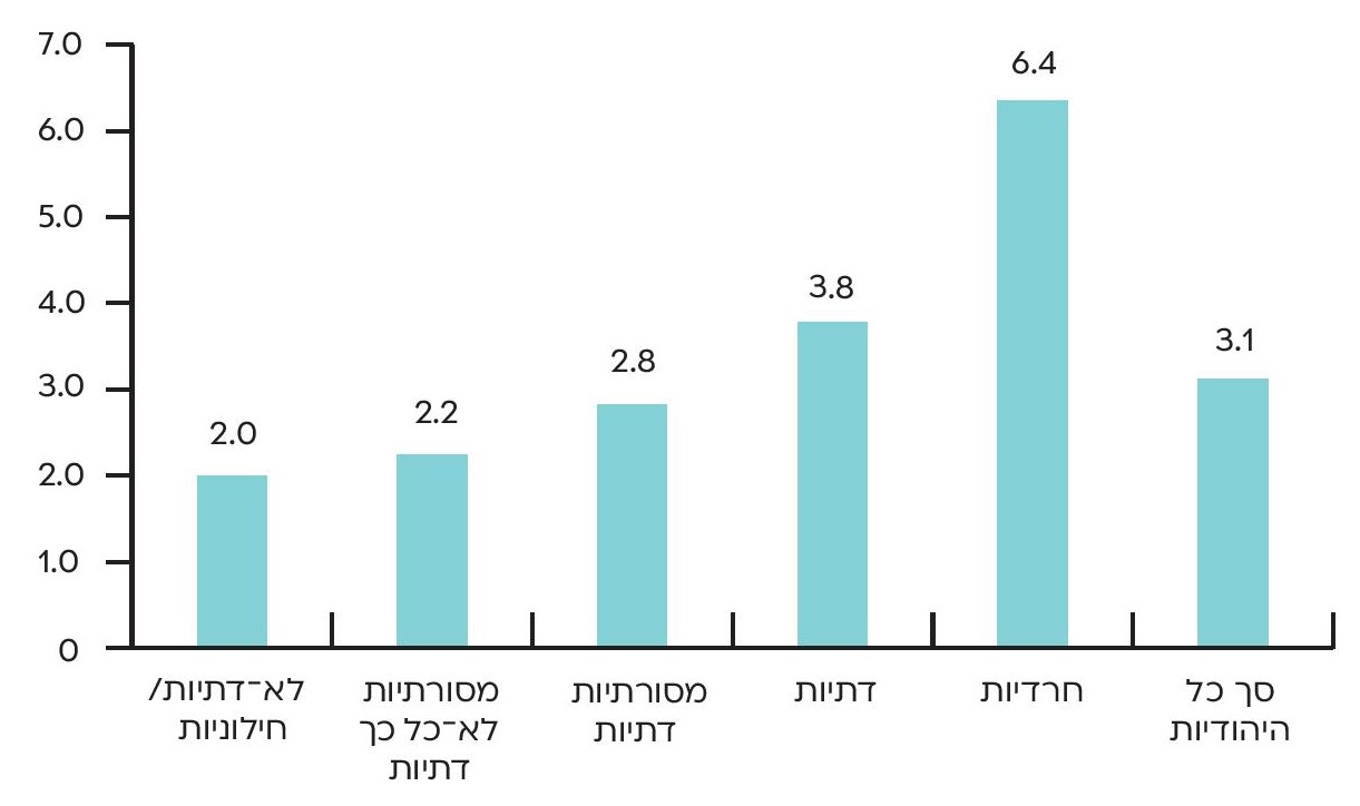 בשנים 2022-2020 היה שיעור הפריון הממוצע של נשים חרדיות 6.4 ילדים לאישה. השיעור הממוצע במדינות ה-OECD עומד על 1.6 ילדים לאישה בלבד, והשיעור הממוצע בקרב נשים יהודיות לא-חרדיות על 2.5 ילדים לאישה. כאשר בוחנים את שיעורי הפריון של הנשים היהודיות לפי מידת הדתיות על הרצף החרדי–חילוני, מתברר ששיעור הפריון של אישה דתית הוא 3.8 ילדים; של אישה מסורתית דתית — 2.8 ילדים; של אישה מסורתית לא כל כך דתית — 2.2 ילדים; ושל אישה חילונית — 2.0 ילדים. בישראל יש אפוא קשר ישיר בין רמת הדתיוּת של האישה (על פי הגדרה עצמית על הרצף החרדי–חילוני) לבין מספר הילדים שהיא יולדת במהלך חייה.