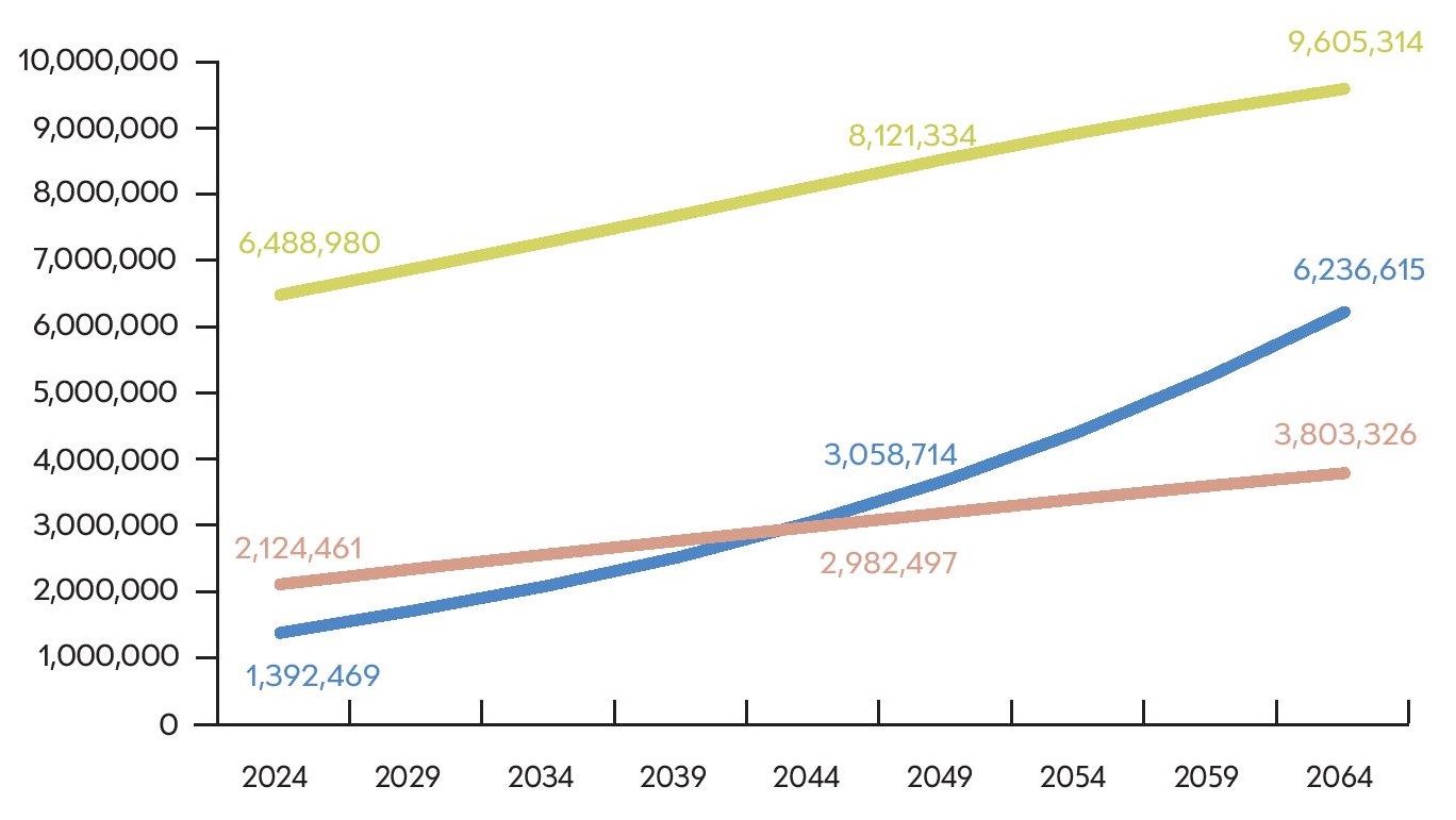 תרשים א/5 תחזית אוכלוסייה, לפי קבוצת אוכלוסייה, 2064-2024 (במספרים מוחלטים)