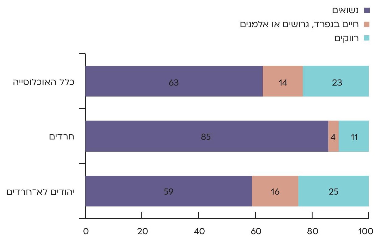 לאורך השנים ניכרת יציבות בשיעור הרווקים, הגרושים והאלמנים באוכלוסייה החרדית, ושיעורם עמד על כ-15% בשנת 2003 וגם בשנת 2023. באוכלוסייה היהודית הלא-חרדית חלה עלייה בשיעור זה: מ-37% ב-2003 ל-41% ב-2023.