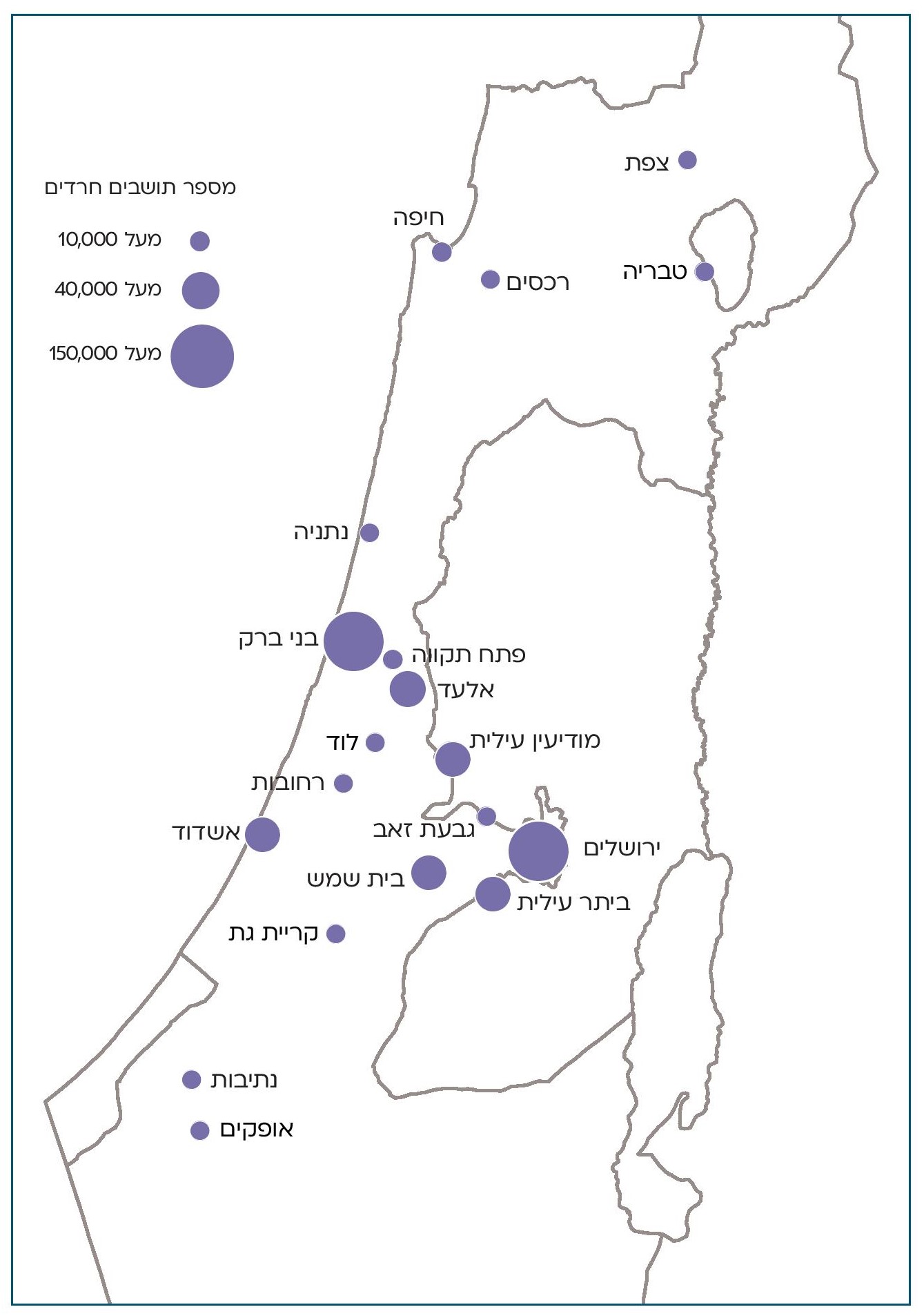 "ערי הבירה" של האוכלוסייה החרדית הן ירושלים ובני ברק. בשתי הערים האלה התגוררה עד שנות ה-90 של המאה ה-20 מרבית האוכלוסייה החרדית, וגם כיום (נתוני 2022) מתגוררים בהן 41.5% מאוכלוסייה זו. בירושלים, הניצבת בראש, מתגוררים 24.4% מהאוכלוסייה החרדית, ובבני ברק, השנייה לה, 17.1%. עוד קבוצה של יישובים שאוכלוסייה חרדית גדולה גרה בהם היא ערי הפרוור החרדיות, ובהן בית שמש, מודיעין עילית, ביתר עילית ואלעד. ערים אלו הוקמו בשנות ה-90 של המאה ה-20, והן חרדיות ברובן המוחלט. אומנם בית שמש נוסדה שנים רבות קודם לכן, אך בשנות ה-90 הוקמה בה רמת בית שמש, שרוב המתגוררים בה הם חרדים. כיום רוב מוחלט מתושבי העיר בית שמש הם חרדים, ובשל ההגירה הרחבה אליה היא כיום העיר החרדית השלישית בגודלה אחרי ירושלים ובני ברק. בארבע ערי הפרוור החרדיות יחד גרים 26% מהאוכלוסייה החרדית (בית שמש — 9.7%, מודיעין עילית — 7%, ביתר עילית — 5.4% ואלעד — 3.9%). קבוצה שלישית של ריכוזי חרדים ממוקמת בערים גדולות שבהן יש התיישבות חרדית ותיקה שהתחזקה בשל גלי הגירה של צעירים חרדים. בערים אלו מתגוררים 11% מהאוכלוסייה החרדית (אשדוד — 4.1%, פתח תקווה — 2.2%, חיפה — 1.5%, רחובות — 1.2%, נתניה — 1.4% ותל אביב — 0.6%). בשלושה סוגי ריכוזים אלו, המורכבים מ-12 ערים, חיים 78.5% מהאוכלוסייה החרדית בישראל.
