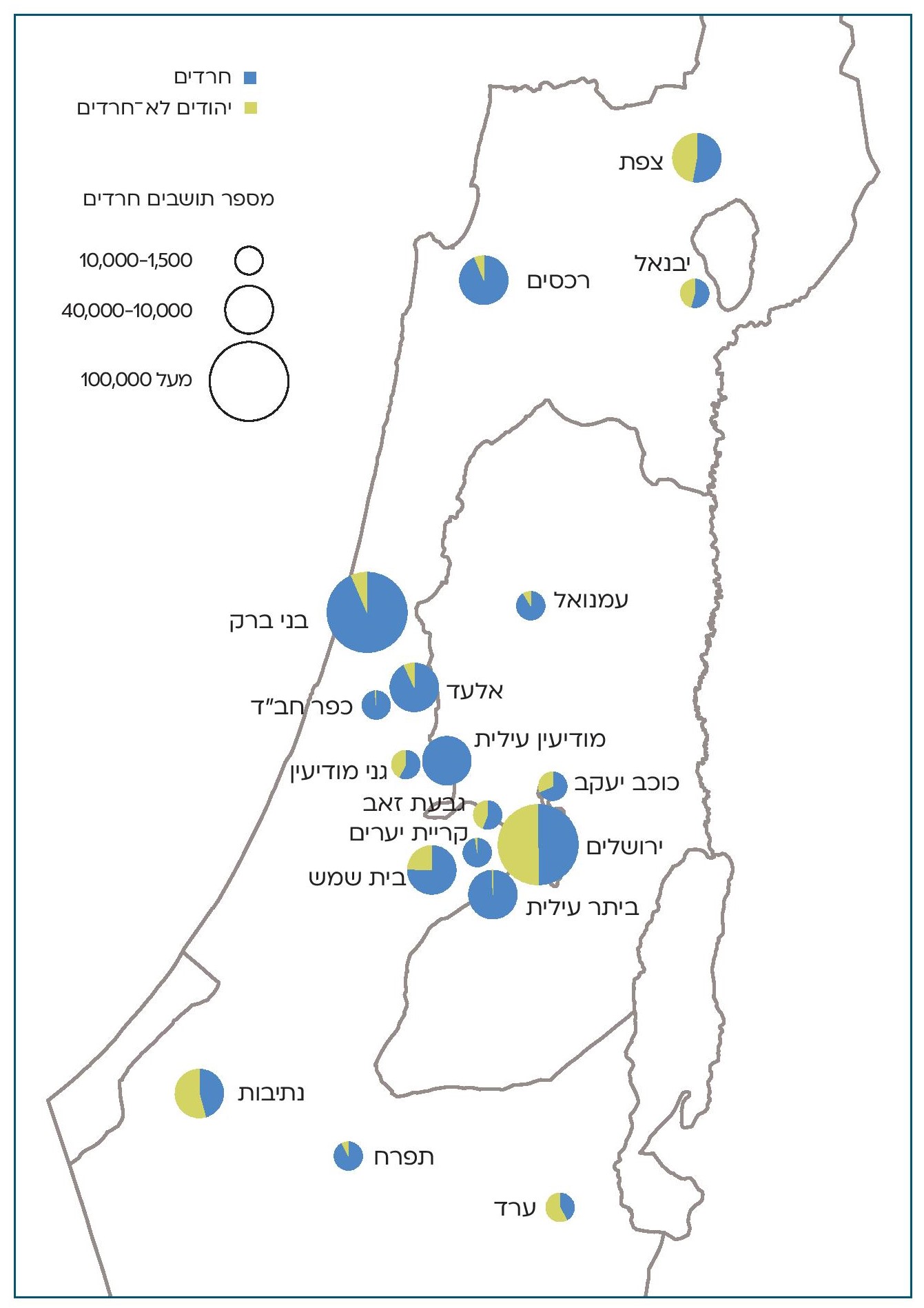 36.2% מהחרדים חיים ביישובים שמתגוררת בהם כמעט רק אוכלוסייה חרדית (80% מהאוכלוסייה ויותר). יישובים אלו הם בני ברק, מודיעין עילית, ביתר עילית, אלעד, רכסים, עמנואל, קריית יערים, תפרח וכפר חב"ד. 41.3% מהחרדים חיים ביישובים שגודלה של האוכלוסייה החרדית בהם הוא בין מחצית מהאוכלוסייה לרוב האוכלוסייה. יישובים אלו הם ירושלים, בית שמש, צפת, גבעת זאב, כוכב יעקב, יבנאל וגני מודיעין.כללנו את ירושלים בקבוצה זו משום שחלקם של החרדים בה הוא 50% מן האוכלוסייה היהודית. האוכלוסייה היהודית והערבית בעיר אינן מעורבות זו בזו וגם מעמדן האזרחי אחר (הערבים בירושלים אינם אזרחי ישראל אלא תושבים). אם כן, למעלה משלושה רבעים מהחרדים (77.5%) גרים ביישובים שהם רוב האוכלוסייה בהם.