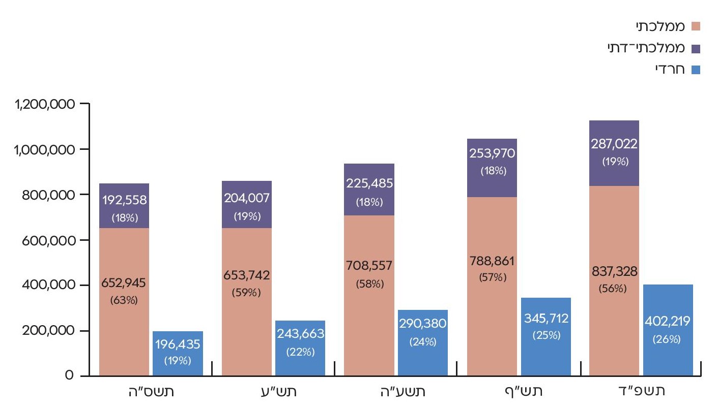 | ב.1. תלמידים (לפי פיקוח) | • עיבודי המחברים לנתוני הלשכה המרכזית לסטטיסטיקה, תחום בכיר חינוך, אגף בכיר חינוך וחברה • "חינוך במבט רחב", משרד החינוך |