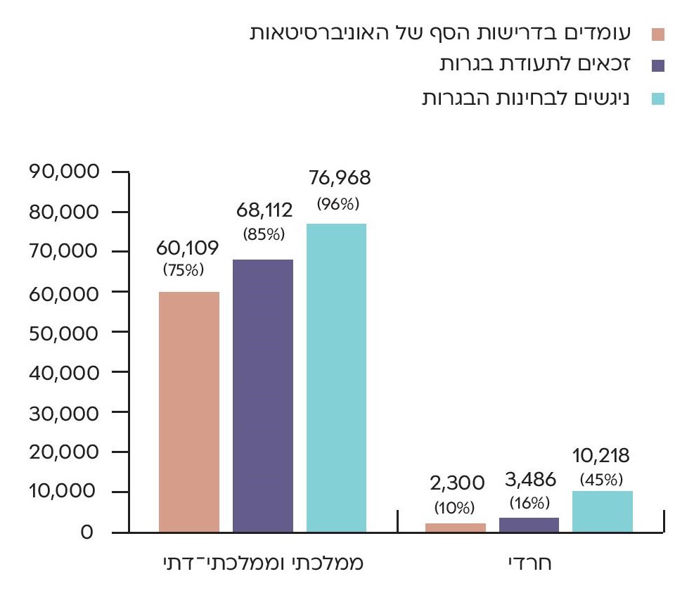 ניתן לראות גם גידול בשיעור החרדים בעלי תעודת בגרות העומדים בדרישות הסף של האוניברסיטאות, מ-7% בשנת הלימודים תשע"ז (2016/17) ל-10% בשנת הלימודים תשפ"ב (2021/22).