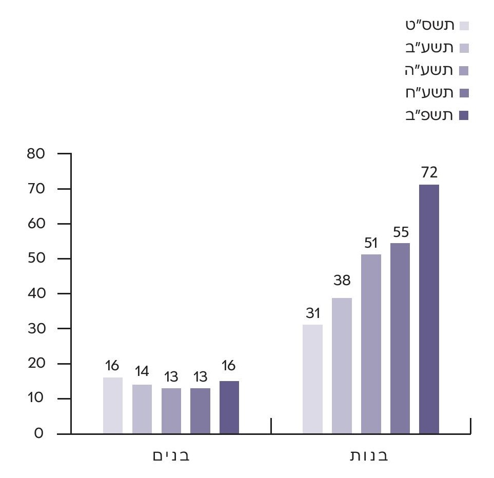 מרבית הסטודנטים בישראל העוברים הכשרה טכנולוגית הם גברים, ואולם הגברים החרדים הם 11% בלבד מהסטודנטים הגברים הלומדים את המקצועות האלה. הנשים החרדיות, לעומת זאת, הן 39% מכלל הסטודנטיות הלומדות את המקצועות האלה בישראל.