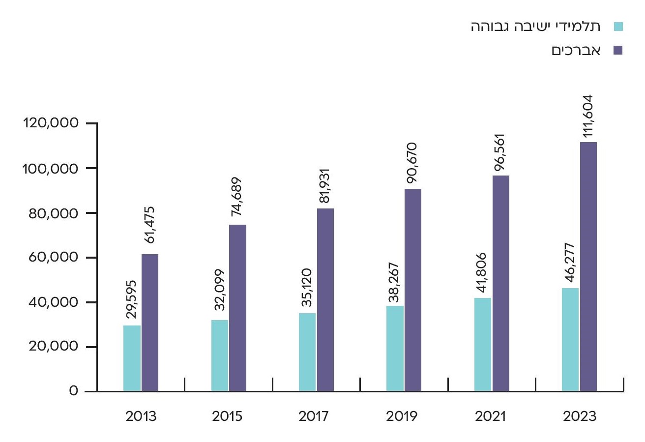 בשנים 2023-1999 גדל בהתמדה מספרם של בני הישיבות והאברכים, בקצב של 4% בשנה, הדומה לשיעור הגידול של החברה החרדית באוכלוסיית המדינה. ואולם עיון בנתונים מעלה שיש קשר בין נוכחות המפלגות החרדיות בקואליציה (ותקציב המוסדות התורניים) לבין קצב הגידול של בחורי הישיבות והאברכים. השנים היחידות שהייתה בהן ירידה במספרם היו 2014-2013, שבהן המפלגות החרדיות לא היו בקואליציה, ותלמידי ישיבה ואברכים בגילים 22-28 קיבלו פטור משירות צבאי. באותו פרק זמן גם צנחה תמיכת המדינה בתלמידי ישיבות ובאברכי כולל שלא שירתו בצה"ל בכ-50%. גם בשנת 2021, שבה המפלגות החרדיות לא היו בקואליציה ותקציב המוסדות התורניים נפגע במידת מה, שיעור הגידול במספר בחורי הישיבות והאברכים היה 2.5% בלבד. לעומת זאת, בשנים 2023-2018 עלה מספר בחורי הישיבות והאברכים ב-5.2% בממוצע. בשנת 2023, השנה שבתחילתה שבו המפלגות החרדיות לקואליציה, חלה עלייה דרסטית במספרם, בשיעור של 8.5%.