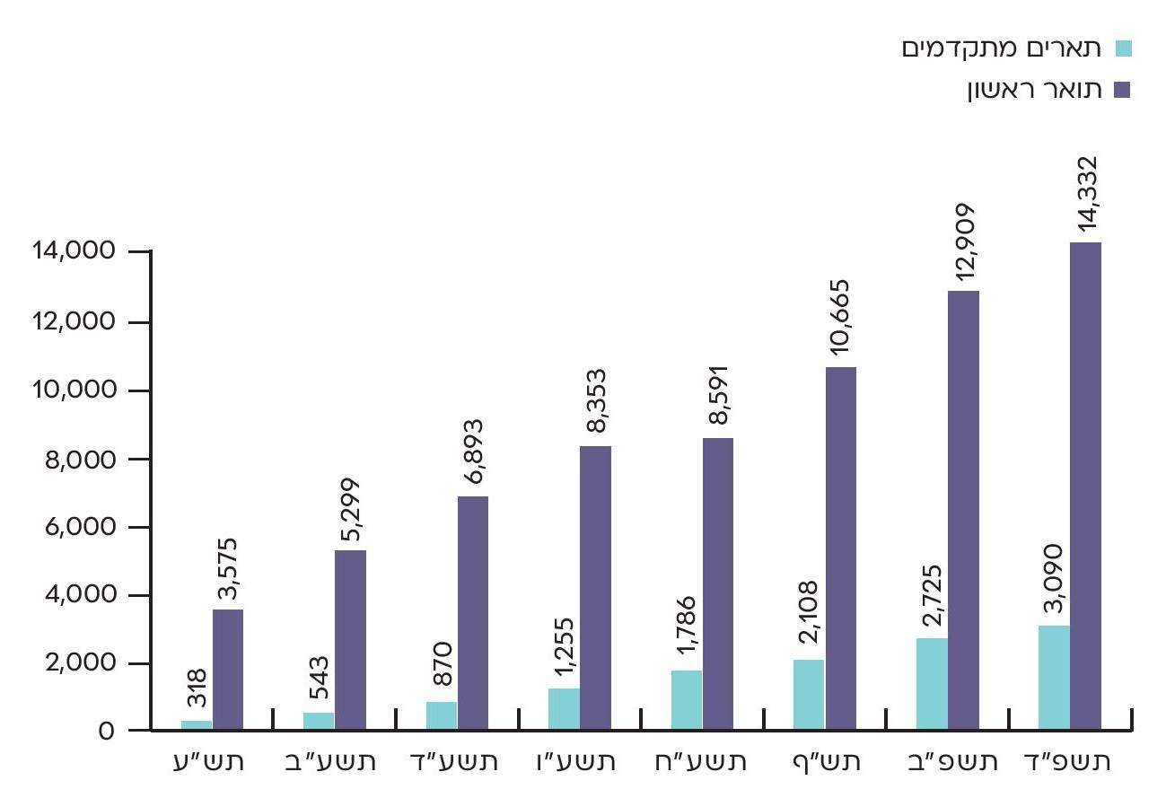 מספר הסטודנטים החרדים לתארים מתקדמים (שני ושלישי) עלה בשנים תש"ע-תשפ"ד (2023/24-2009/10) בקצב ממוצע שנתי מהיר מזה של כלל הסטודנטים החרדים (17% לעומת 10%). וכך, גם בשנת תשפ"ד חלה עלייה של 17% במספר הסטודנטים לתארים מתקדמים, לעומת עלייה של 2% בלבד במספר הסטודנטים החרדים לתואר ראשון. בשנים הקרובות נבחן אם ההאטה בקצב הגידול של הסטודנטים החרדים לתואר ראשון היא עקבית או שהיא קשורה למלחמת חרבות ברזל. הסטודנטים החרדים לתארים מתקדמים לומדים ברובם במוסדות האקדמיים הכלליים, שלא כמו חבריהם הסטודנטים לתואר ראשון, הלומדים ברובם המוחלט בקמפוסים נפרדים למגזר החרדי.