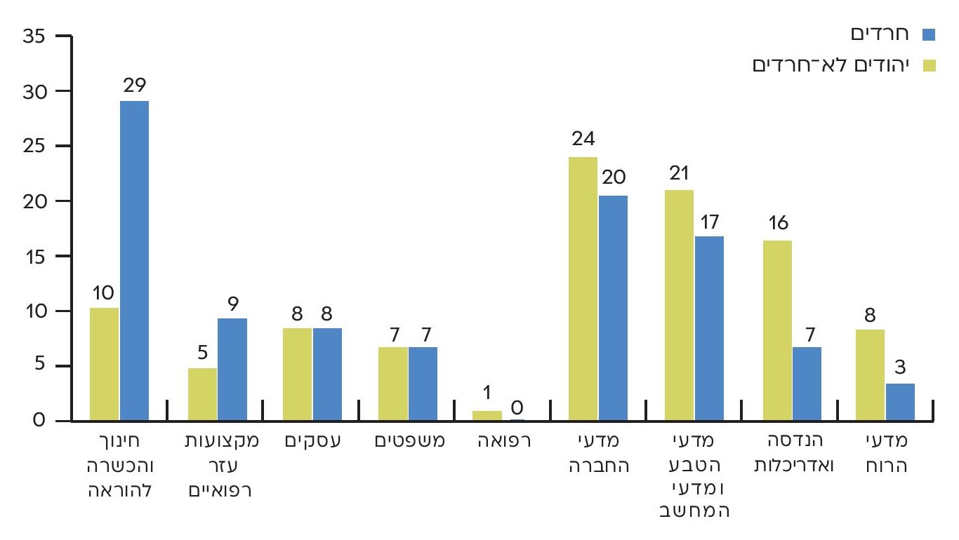 אפשר אפוא להסיק שסטודנטים חרדים מעדיפים ללמוד מקצועות הנחשבים פרקטיים או שמאפשרים עבודה גם בתוך הקהילה החרדית (חינוך והוראה, מקצועות עזר רפואיים. בתחומי לימוד אקדמיים שנועדו להעשיר את הידע, כמו מדעי הרוח, או בתחומי לימוד המחייבים ידע מתמטי מתקדם (הנדסה), יש נוכחות חרדית קטנה יחסית. תופעה זו בולטת במיוחד בקרב סטודנטיות חרדיות. 32% מהן לומדות חינוך, לעומת 24% מהסטודנטים החרדים; 12.5% מהן לומדות מקצועות עזר רפואיים, לעומת 3.5% בלבד מהגברים. לעומת זאת, רק 5% לומדות הנדסה ואדריכלות, לעומת 9.5% מהגברים. הבדל בולט נוסף הוא בין השיעור הנמוך של סטודנטיות חרדיות למשפטים (4%) לבין השיעור הגבוה יחסית של סטודנטים חרדים גברים במקצוע הזה (13%); הסיבה לכך היא לגיטימציה מוגבלת בחברה החרדית לעיסוק של נשים חרדיות בעריכת דין. שיעור דומה של חרדים (21%) וחרדיות (19.5%) לומדים מדעי החברה.