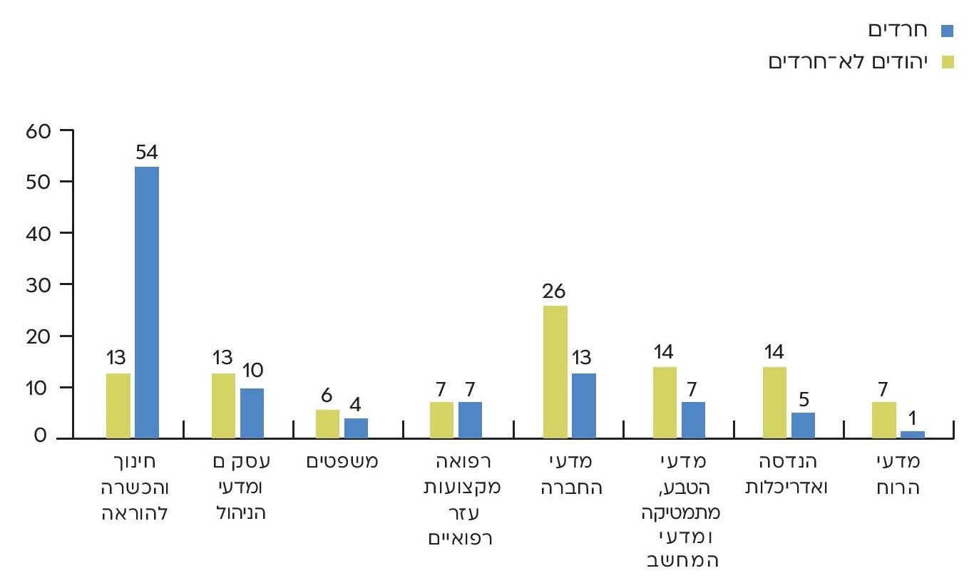 התפלגות תחומי הלימוד לתואר ראשון של הסטודנטים והסטודנטיות החרדים שונה מאוד מההתפלגות של כלל אוכלוסיית הסטודנטים. סטודנטים חרדים לומדים בשיעורים גבוהים יותר חינוך והוראה (29% לעומת 10% בקרב סטודנטים יהודים לא-חרדים) ומקצועות עזר רפואיים (9.5% לעומת 4.5%). נוכחות מוגבלת של סטודנטים חרדים ניכרת במדעי החברה (20% לעומת 24%), בלימודי הנדסה (6.5% לעומת 16%) ובמדעי הרוח (3% לעומת 8%). ממצא מעניין הוא השיעור הגבוה יחסית של חרדים הלומדים מדעי המחשב ומדעי הטבע (17%), אף שהוא נמוך מהשיעור בקרב סטודנטים יהודים לא-חרדים (20.5%). שיעור דומה של חרדים ויהודים לא-חרדים לומדים מינהל עסקים (כ-8%-9%) ומשפטים (6.5%).
