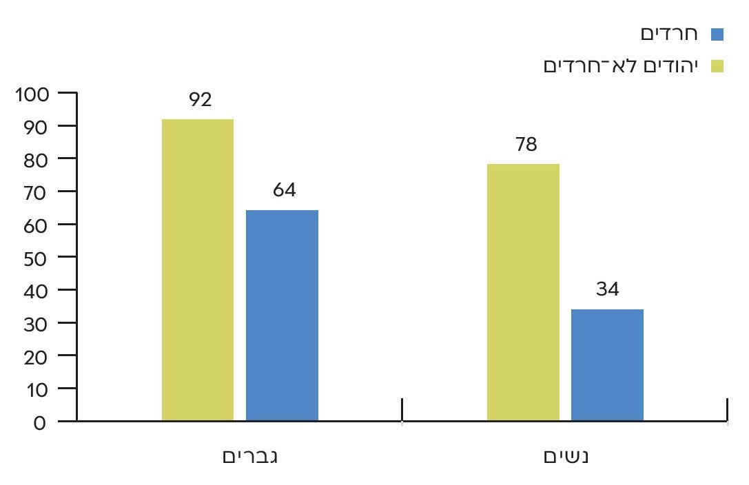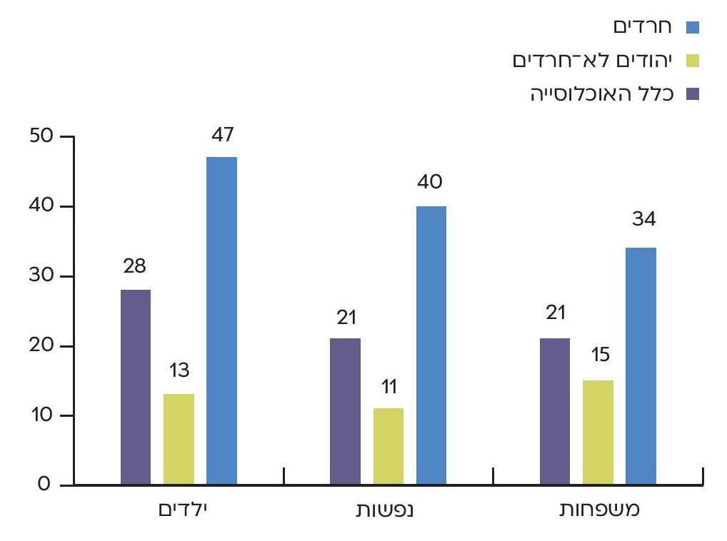 תמונת המצב של תחולת העוני לאחר תשלומי ההעברה והמיסים בחלוקה לנפשות, למשפחות ולילדים לשנת 2022 מלמדת כי שיעור הנפשות באוכלוסייה החרדית החיות מתחת לקו העוני לאחר תשלומי העברה ומיסים (39%) גבוה בהרבה משיעורן בכלל האוכלוסייה (20%) ומשיעורן באוכלוסיית היהודים הלא-חרדים (14%).