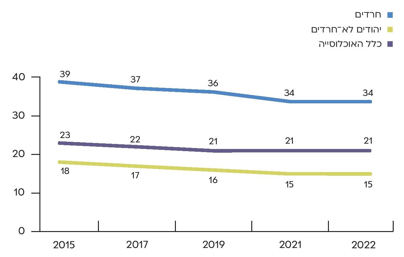 בשנים 2015–2022 חלה ירידה בתחולת העוני בקרב משפחות חרדיות – מ-39% ל-34%. ירידה זו יכולה להיות מוסברת בגידול בשיעור התעסוקה של נשים חרדיות, בעלייה ברמת ההכנסות בקרב העובדים ובגידול בתמיכת המדינה באברכים ובקצבאות הילדים. תחולת העוני באוכלוסייה החרדית עומדת כיום על הרמה הנמוכה ביותר שלה מאז שנת 2015.