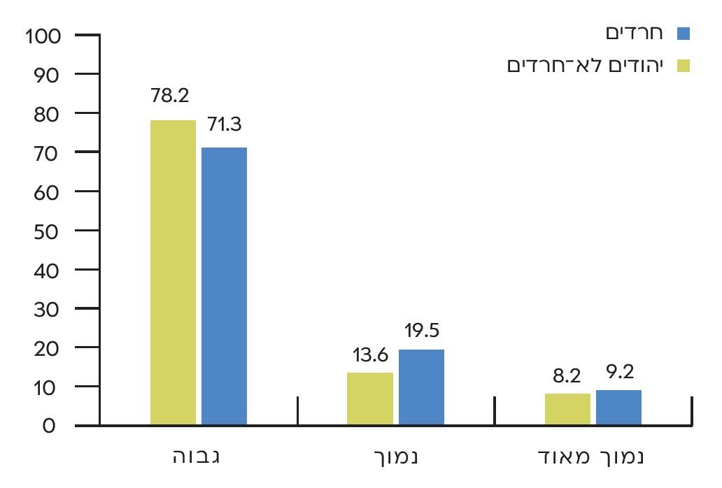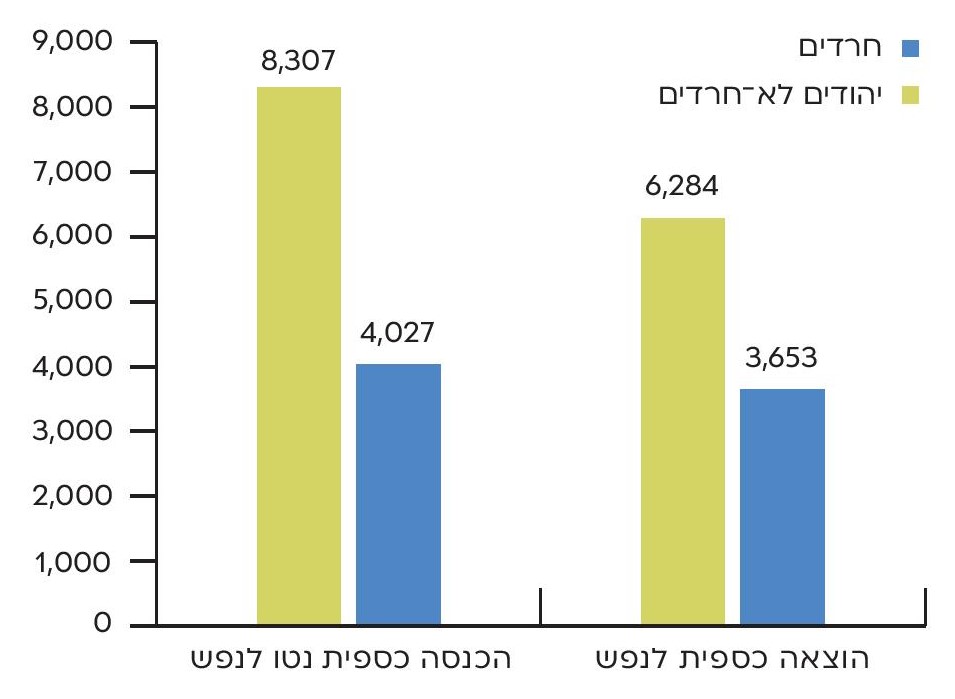 מקובל לחשב את ההכנסה לנפש על פי סולם הנותן משקל פוחת והולך לכל נפש בשל העלות השולית שלה למשק הבית. לפי חישוב זה, ההכנסה נטו לנפש תקנית במשפחה חרדית היא 4,027 ש"ח, והיא עומדת על 48% בלבד מההכנסה לנפש תקנית במשפחה יהודית לא-חרדית (8,307 ש"ח). הפער הגדול מוסבר במספר הנפשות הגבוה במשק הבית החרדי (5.1), לעומת משק הבית היהודי הלא-חרדי (2.8); במספר המפרנסים הממוצע; ובהכנסה נמוכה מעבודה (10,221 ש"ח במשק בית חרדי, לעומת 18,604 ש"ח במשק בית יהודי לא-חרדי). אפשר שבמציאות הפערים בהכנסות קטנים יותר בשל ההכנסות מעבודה שאינן מדוּוחות באוכלוסייה החרדית.