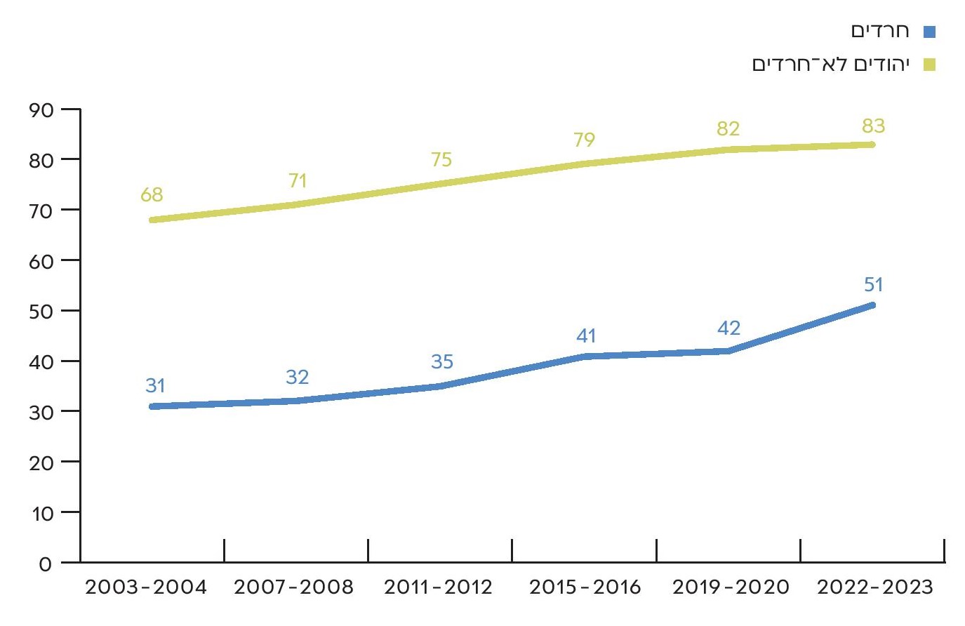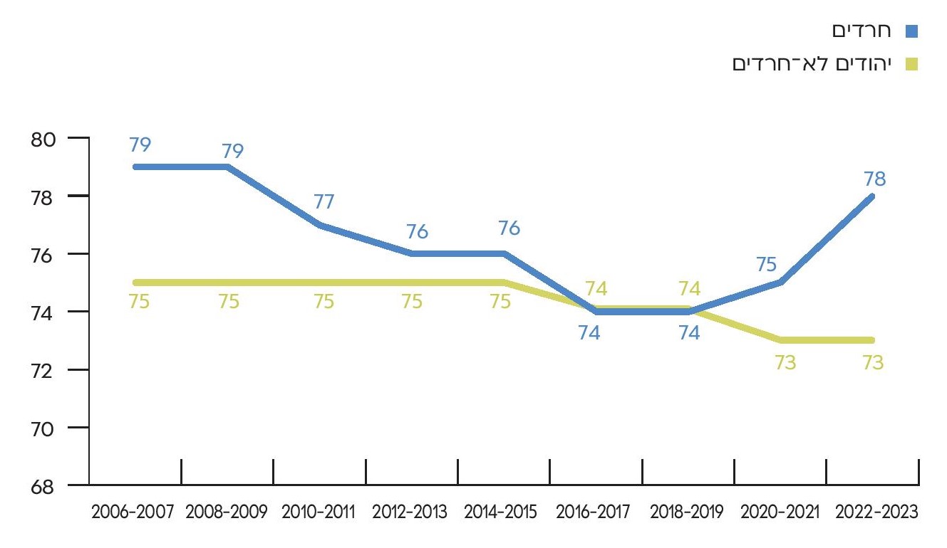 בשנים 2018-2006 נרשמה באוכלוסייה החרדית ירידה בשיעור בעלי הדירות — מ-79% ל-74%, ככל הנראה בשל עלייה ביוקר הדיור המקשה על רכישת דירה. עם זאת, משנת 2019 אנו רואים עלייה מחודשת בבעלות על דירות בקרב חרדים, ושיעור בעלי הדירות שב ועלה ל-78% בשנים 2023-2022. ייתכן שהסיבה לעלייה המחודשת היא הטבה במצב הכלכלי של משקי הבית החרדיים המתבטאת בעלייה ברמת ההכנסה וירידה בשיעורי העוני, כפי שראינו בתחילת פרק זה.