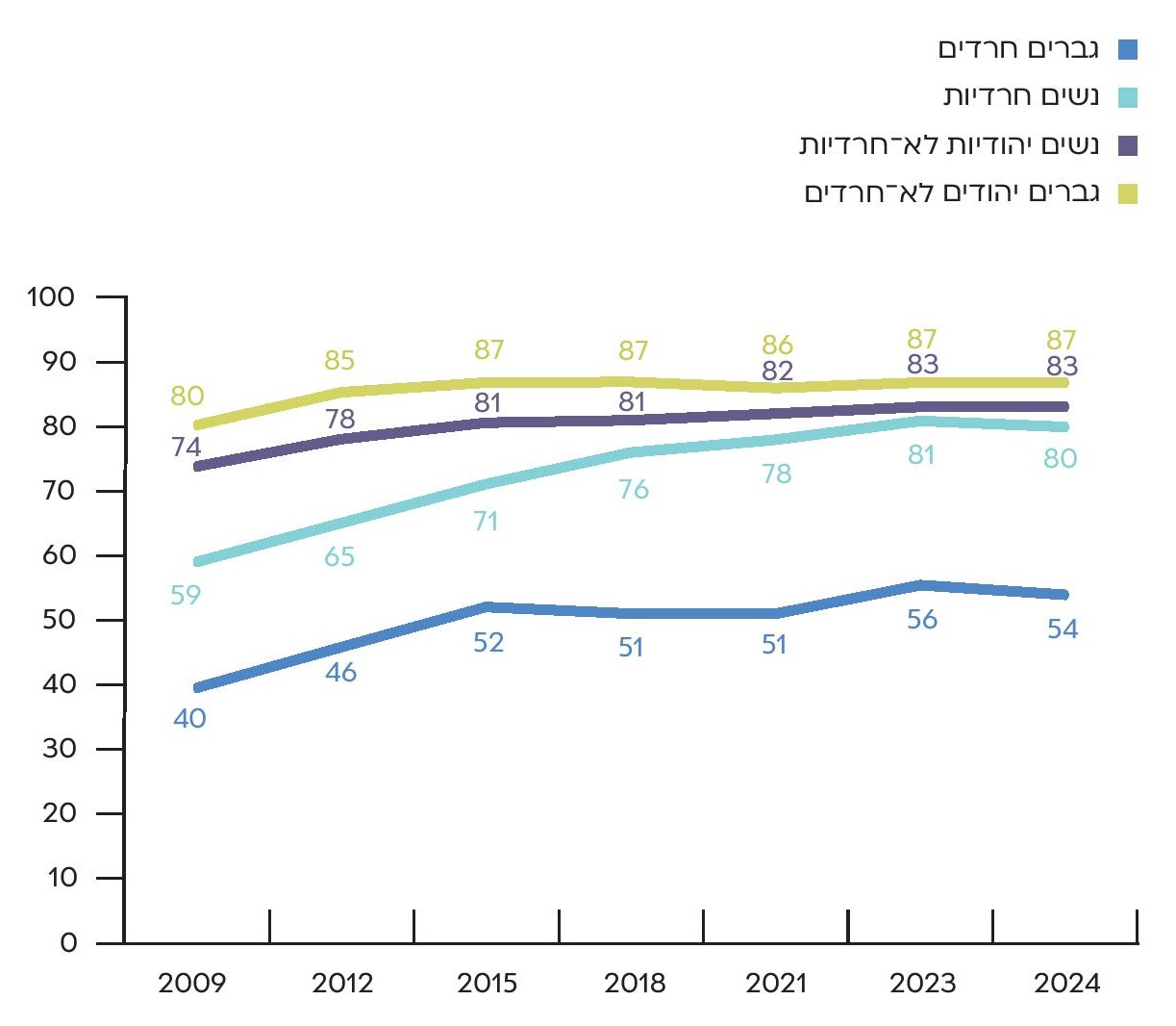 לעומת זאת, שיעורי התעסוקה בקרב נשים חרדיות הוסיפו לעלות ברציפות לאורך כל השנים. כך, אם בשנת 2015 עמד שיעור המועסקות החרדיות על 71%, בשנת 2023 הוא הגיע כבר ל-81%. הפער בהיקפי התעסוקה בין נשים חרדיות לנשים יהודיות לא-חרדיות עמד על פחות מ-3%. נתונים לא סופיים לשנת 2024 (שלושה רבעונים ראשונים) מלמדים על התמתנות המגמה (80%).