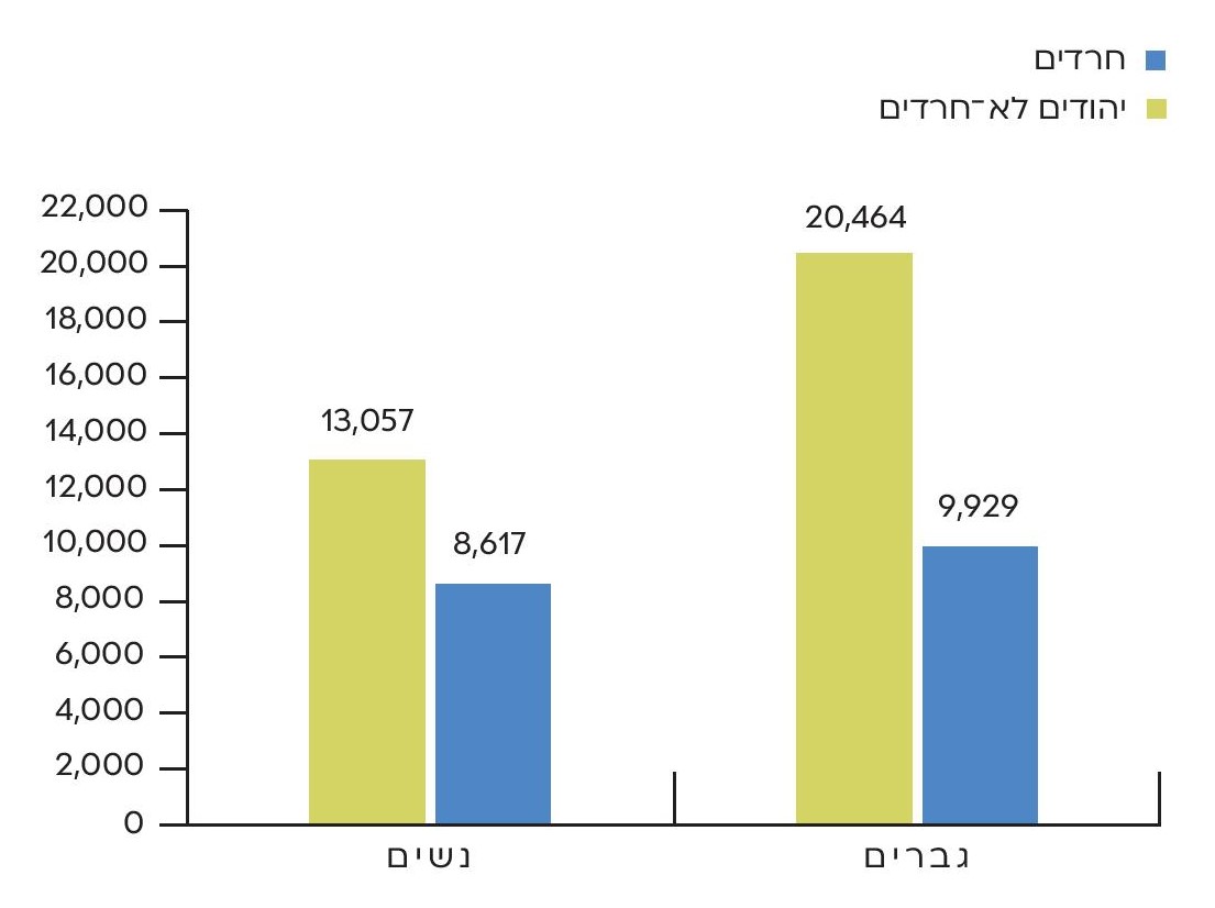 לא-חרדים (20,464 ש"ח); הנשים החרדיות השתכרו באותה שנה 8,617 ש"ח בחודש בממוצע, 66% מההכנסה הממוצעת החודשית בקרב נשים יהודיות לא-חרדיות (13,057 ש"ח).
