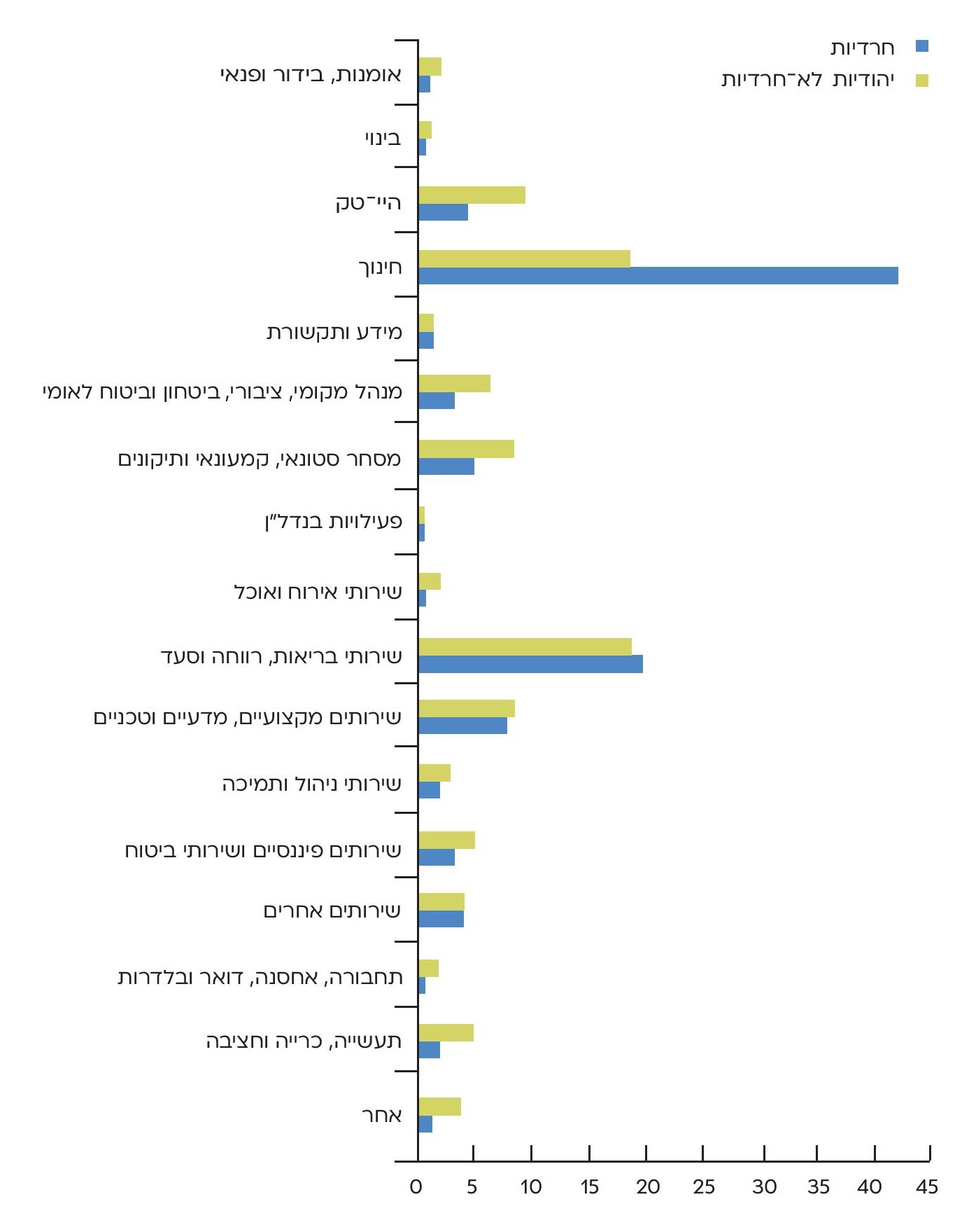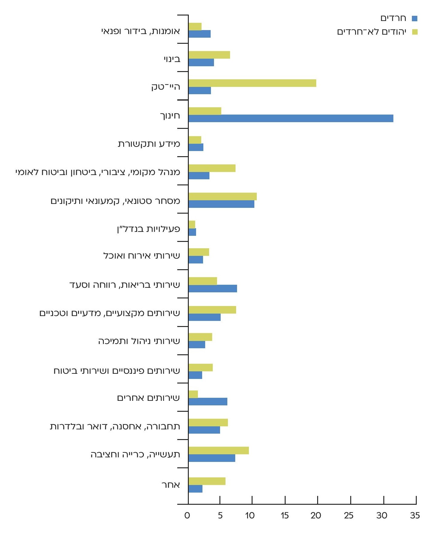 בשנת 2014, למשל, עסקו 28% מהגברים החרדים העובדים בחינוך, ובשנת 2023 — 32%; בכלל האוכלוסייה היהודית שיעור הגברים שעסקו בחינוך ב-2023 נותר נמוך לאין ערוך — כ-5%. בתחום המינהל הציבורי הפער בין חרדים ליהודים לא-חרדים נותר גדול. גם שיעור הגברים החרדים העוסקים בהיי-טק נותר יציב ונמוך (כ-3%), ואילו שיעור הגברים היהודים הלא-חרדים עלה מ-12% ל-20%.