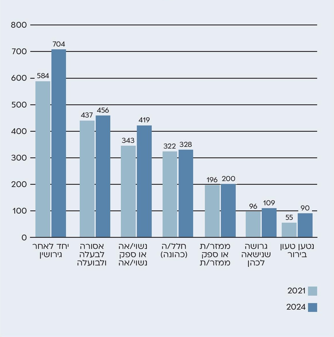 תרשים ב/6. יהודים הרשומים ברשימת מעוכבי החיתון, לפי הסיבה שבגינה נרשמו, 2024 בהשוואה ל-2021 (במספרים מוחלטים)