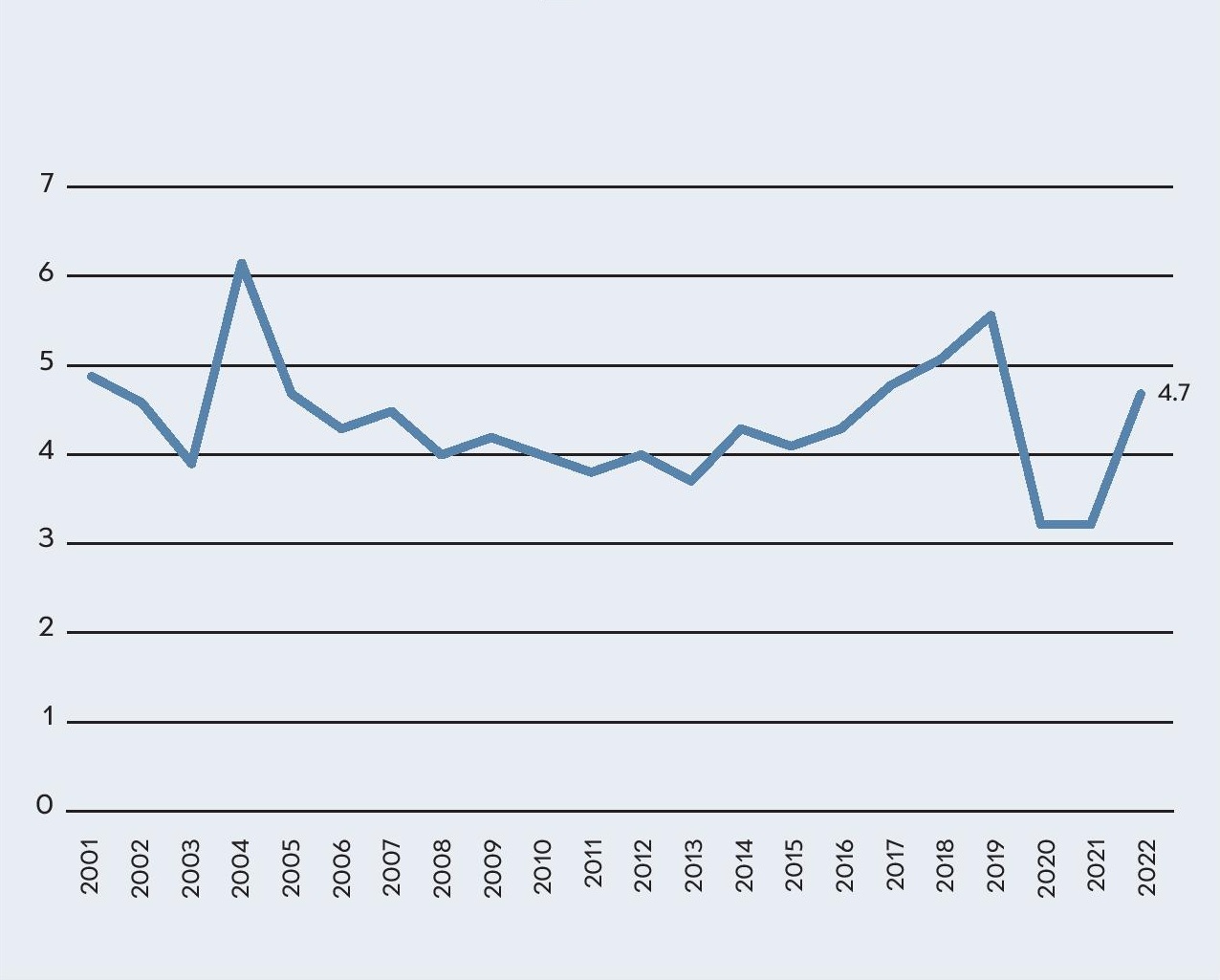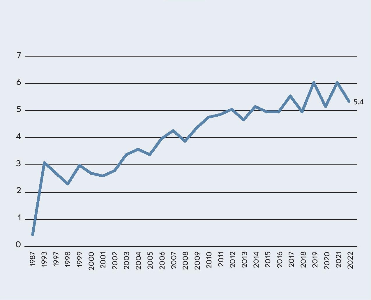 תרשים ב/17. זוגות החיים במשותף שאינם נשואים מתוך כלל הזוגות (נשואים ושאינם נשואים), 2022-1987 (ב־%)