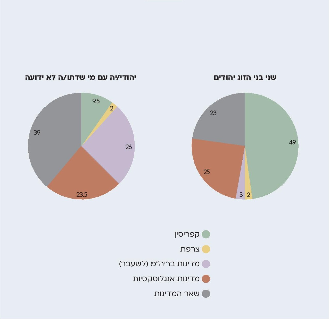 התרשים הבא מציג נתונים על נישואין של זוגות שבהם שני בני הזוג הם יהודים תושבי ישראל ושל זוגות שבהם אחד מבני הזוג הוא יהודי תושב ישראל ודתו של האחר אינה ידועה, בחלוקה לפי המדינות שבהם התקיימו.