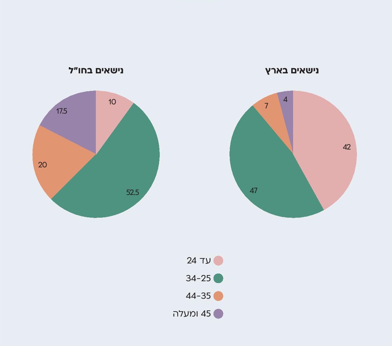 התרשים הבא מציג השוואה בין גילם של הנישאים בארץ לבין גילם של הנישאים בחו"ל.