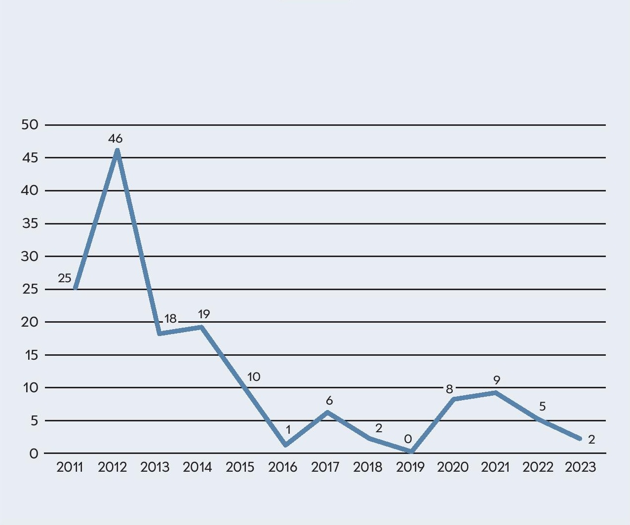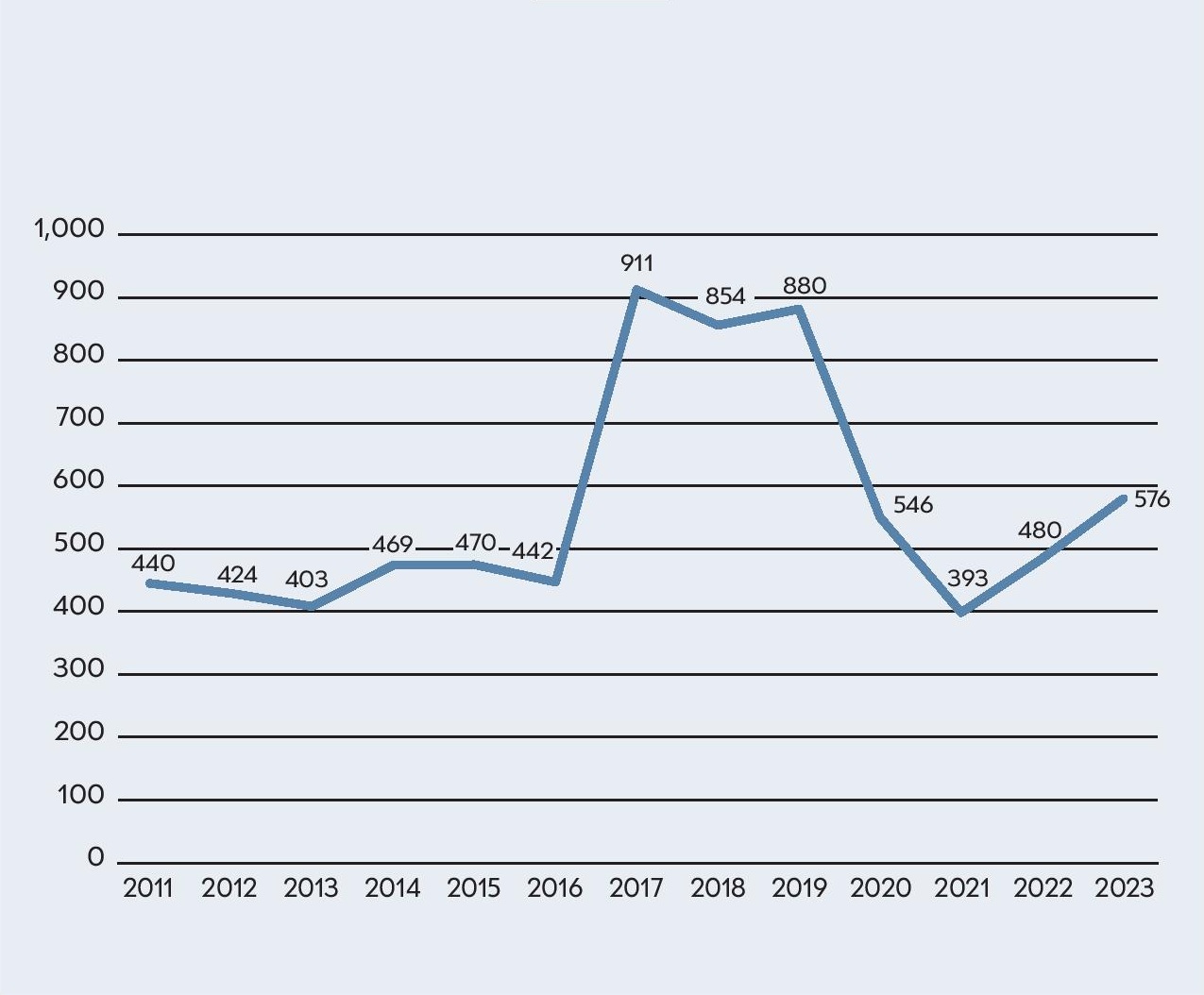 תרשים ב/15. זוגות שנישאו בחו"ל ונרשמו במרשם האוכלוסין בישראל ששני בני הזוג בהם חסרי דת, לפי שנת רישום, 2023-2011 (במספרים מוחלטים)