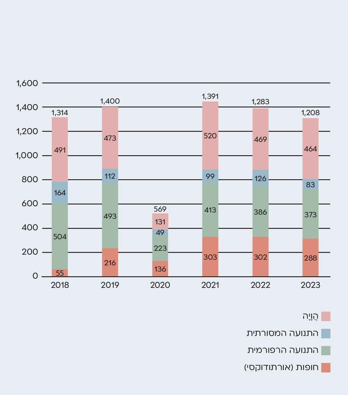 להלן נציג נתונים על היקפי הנישואין שערכו בשנים האחרונות הארגונים והמיזמים הבאים: התנועה ליהדות מתקדמת (רפורמית), התנועה המסורתית (קונסרבטיבית), "חופות" ו"הֲוָיָה". שני הארגונים הראשונים עורכים טקסי נישואין דתיים לא־אורתודוקסיים. לעומתם, במיזם חופות הפועל במסגרת ארגון "השגחה פרטית" עורכים רבנים אורתודוקסיים טקסי נישואין, אך במוצהר מחוץ למסגרת של הרבנות. הארגון עורך טקסי נישואין לזוגות המעוניינים בחתונה אורתודוקסית ומסיבות אידאולוגיות אינם רוצים להתחתן ברבנות, או לזוגות שאינם יכולים להינשא ברבנות בשל המדיניות ההלכתית הננקטת כלפיהם (למשל אי־הכרה ביהדות או בגיור), שאנשי "חופות" חלוקים עליה. מנגד, ארגון "הֲוָיָה" הפועל במסגרת תנועת "ישראל חופשית" מציע לציבור החילוני טקסי חיים ישראליים, ובתוכם נישואין, והוא למעשה ארגון בעל זיקה חילונית ברורה. בדו-שנתון הקודם קיבלנו נתונים גם על טקסי הנישואין שערך מכון "תמורה", המשתייך לזרם היהדות החילונית ההומניסטית, אך על השנים האחרונות לא התקבלו נתונים, ולכן הוא אינו מופיע בתרשים.בשנים 2021-2018 נערכו במסגרת מכון זה 292 טקסי נישואין. לצד ארגונים אלו, ישנם גם זוגות הבוחרים לערוך טקסי נישואין פרטיים באופן עצמאי ולא דרך ארגון – ועורכי הטקסים הם חברים, בני או בנות משפחה, מורים רוחניים או ידוענים – אך עליהם אין מידע מסודר.