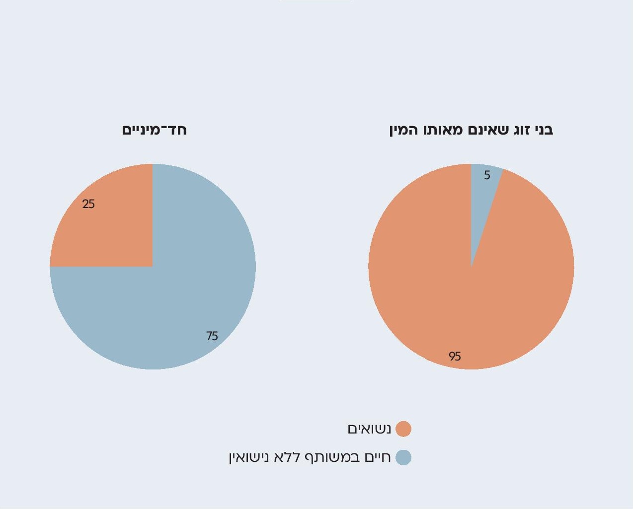 בעוד בקרב הזוגות שבני הזוג בהם אינם מאותו המין רק 5% חיים במשותף ללא נישואין, בקרב הזוגות החד־מיניים 75% חיים במשותף ללא נישואין, הווה אומר: רק 25% מתוכם נישאו. כך, מקרב הזוגות הנשואים, הזוגות החד־מיניים הם שיעור זניח של 0.1%, ואילו מקרב הזוגות החיים במשותף ללא נישואין, זוגות אלו הם 6.8%. ייתכן כמובן שהשיעור הנמוך של זוגות חד־מיניים בקרב הזוגות הנשואים קשור לכך שעל מנת להיות מוכרים כנשואים נדרשים זוגות אלו להינשא בחו"ל, או שהוא נובע מעמדתם ביחס למוסד הנישואין. על כל פנים, נכון לשנים 2022-2019 שיעור הזוגות החד־מיניים (זוגות נשואים וזוגות שחיים במשותף ללא נישואין) היה 0.5% מהזוגות בישראל.