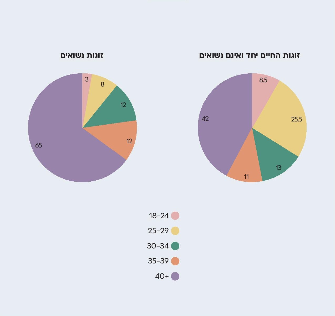 היבט חשוב נוסף במיפוי תופעת הזוגות החיים במשותף ללא נישואין הוא גיל הזוגות לעומת גיל הזוגות הנשואים, כפי שמוצג בתרשים הבא.