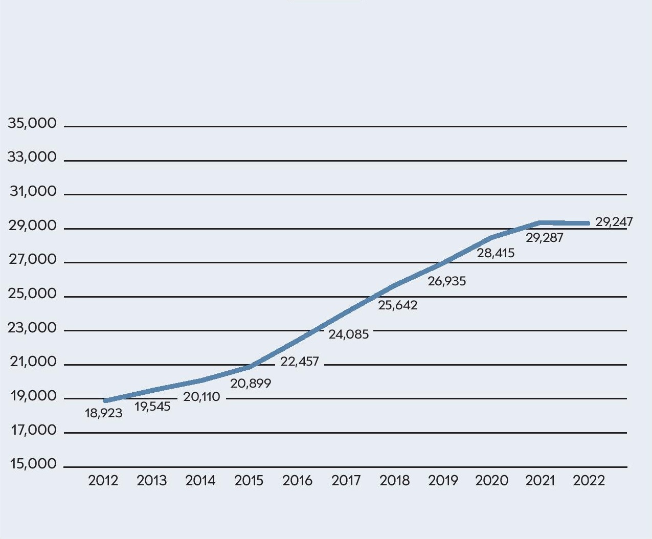 תרשים ב/22. זוגות הרשומים כידועים בציבור במוסד לביטוח לאומי, 2022-2012 (במספרים מוחלטים)