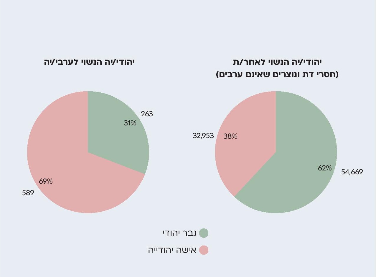 כאמור, בישראל חיים 88,474 יהודים שנשואים לבן זוג שאינו יהודי, 99% מהם נשואים לאחר ו־1% נשואים לערבי. מתוך כלל הזוגות הללו אצל 54,932 זוגות (62%) מדובר בגבר יהודי שנשוי לאישה שאינה יהודייה; ואצל 33,542 זוגות (38%) מדובר באישה יהודייה שנשואה לגבר שאינו יהודי. לנתון זה חשיבות בנוגע להכרה של ילדי בני הזוג כיהודים על פי ההלכה היהודית, שכן רק כאשר האם יהודייה גם ילדיה נחשבים ליהודים.