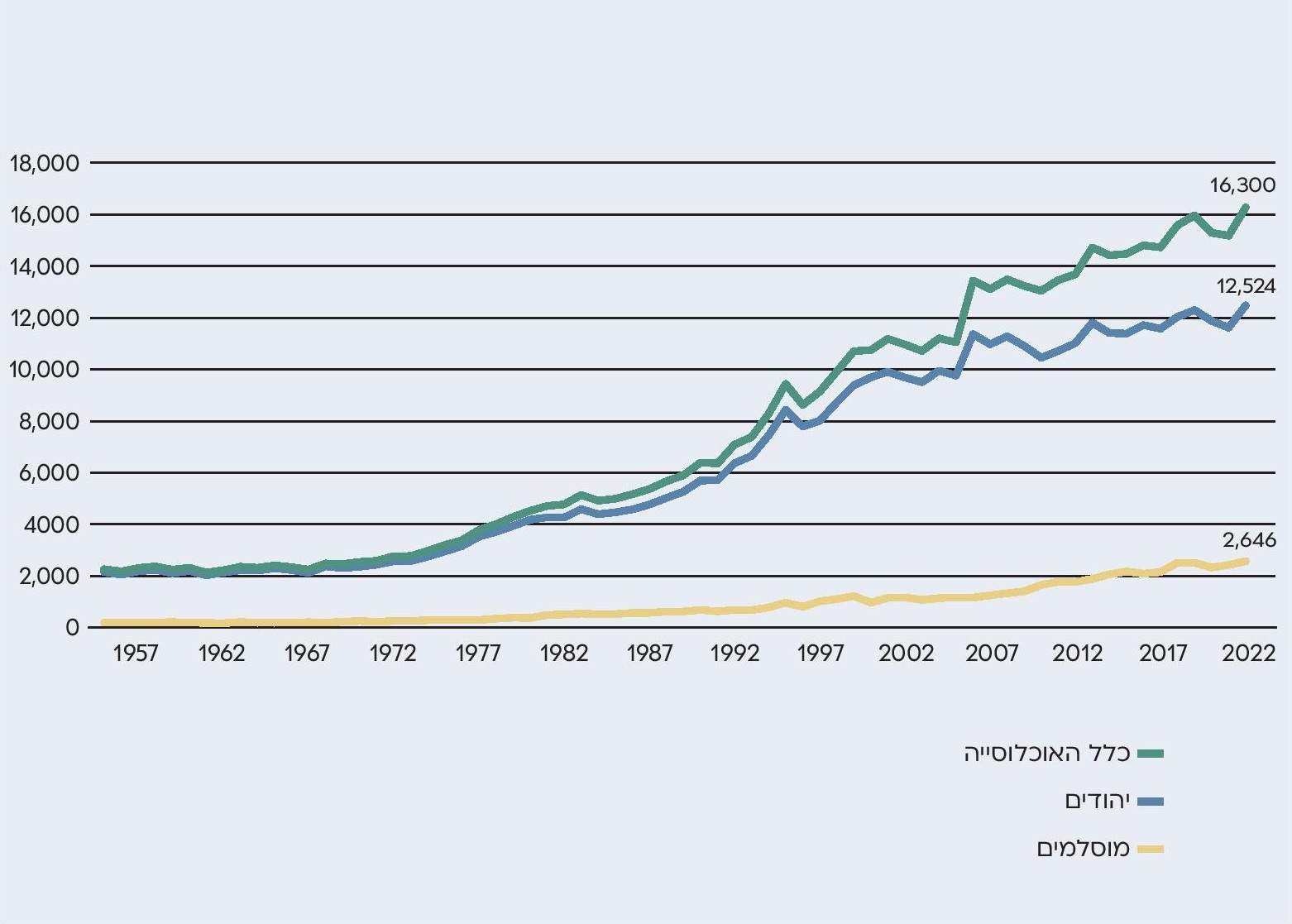 נתוני הלמ"ס בעניין מספר המתגרשים השנתי כוללים את כלל הזוגות שהתגרשו במוסדות הדת בישראל, ומשנת 2006 נכללים בהם גם זוגות שהתגרשו בבתי המשפט לענייני משפחה. כאמור, זוגות בני אותה דת מתגרשים בבית הדין הדתי שהם משתייכים אליו, וזוגות שאינם בני אותה דת מתגרשים בבית המשפט לענייני משפחה. בתרשים הבא מוצג מספר הזוגות שהתגרשו בישראל לאורך השנים, ומתוכו מספר הזוגות ששני בני הזוג בהם משתייכים לאחת משתי הקבוצות הדתיות העיקריות במדינה: יהודים ומוסלמים.