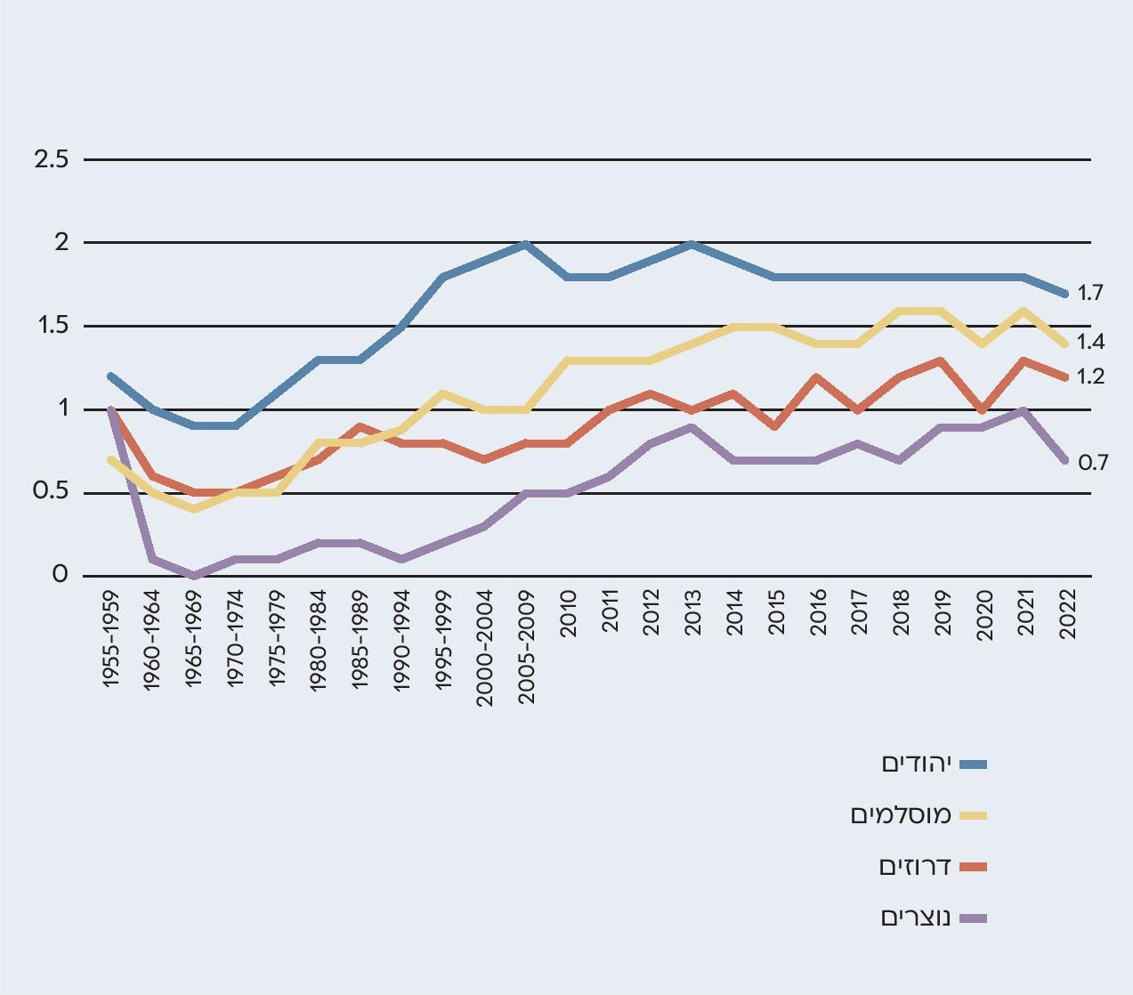 תרשים ג/2. שיעור הגירושין הגולמי בישראל לפי דת, 2022-1955 (מספר הזוגות המתגרשים ל־1,000 נפש)