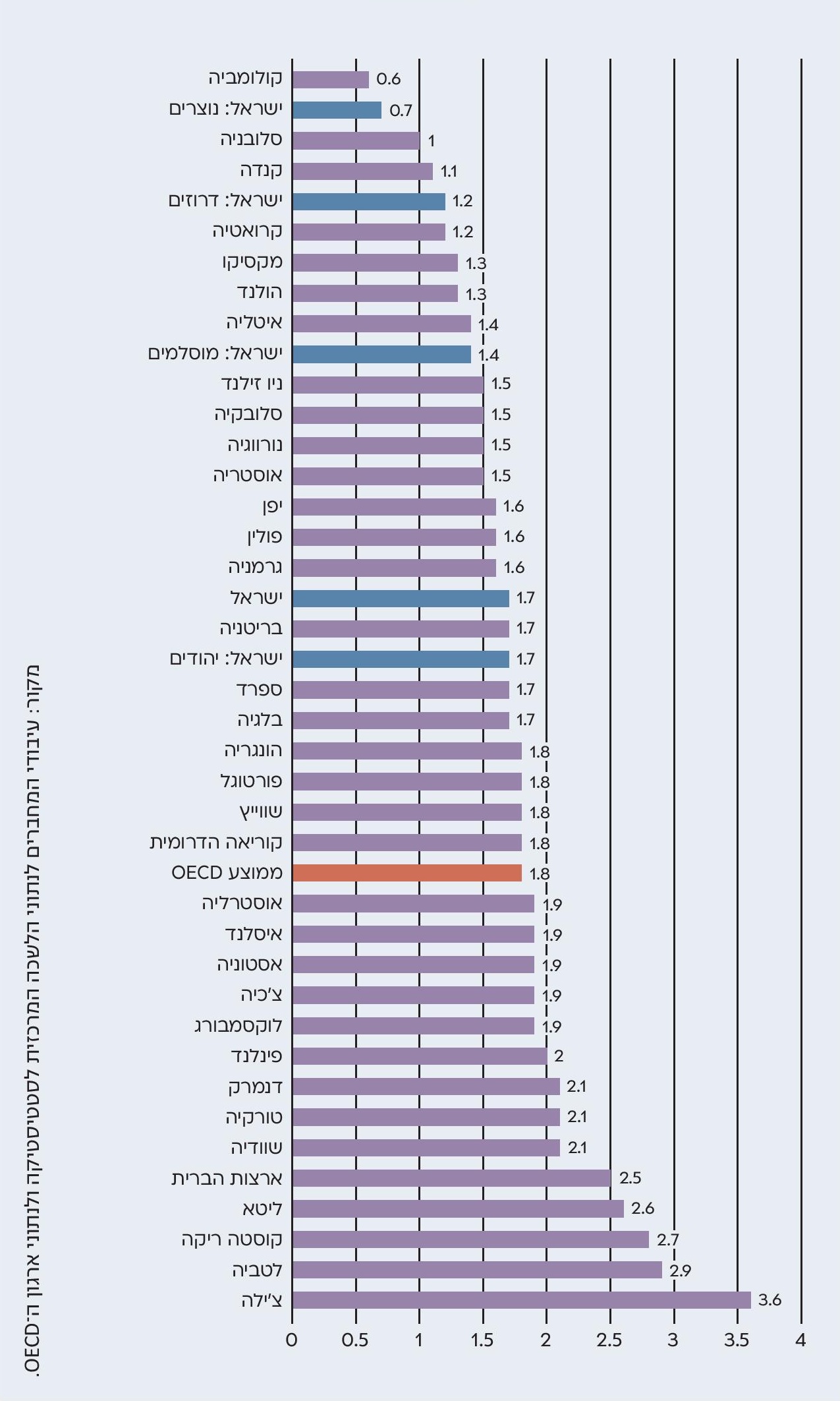 בתרשים הבא מוצג שיעור הגירושין הגולמי של קבוצות האוכלוסייה בישראל בהשוואה למדינות ה־OECD.