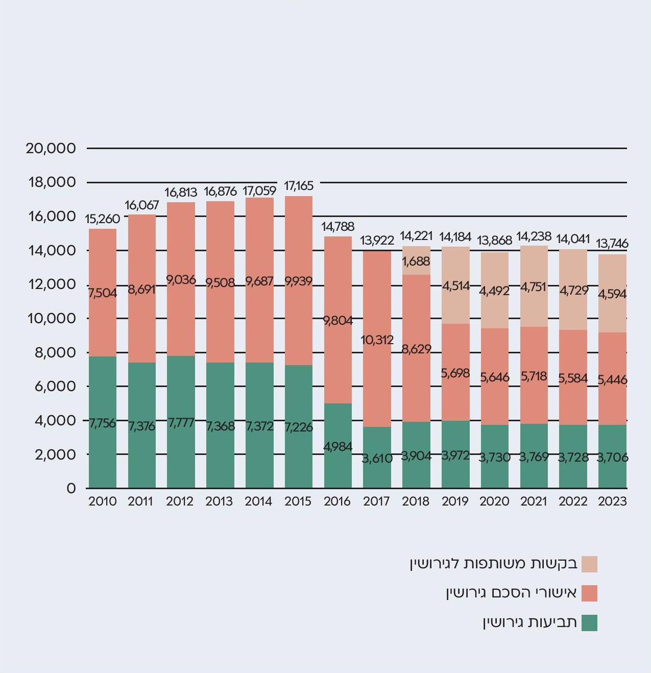 התרשים הבא מציג את כלל תיקי הגירושין שנפתחו בבתי הדין הרבניים. נציין כי מספר התיקים לא תואם את מספר הזוגות המתגרשים (כ־12,000 בשנה), משום שזוג אחד יכול לפתוח הליך בהסכמה ולאחר מכן לעבור להליך סכסוך ולהפך, ולכן ייתכנו כמה תיקים לזוג אחד.