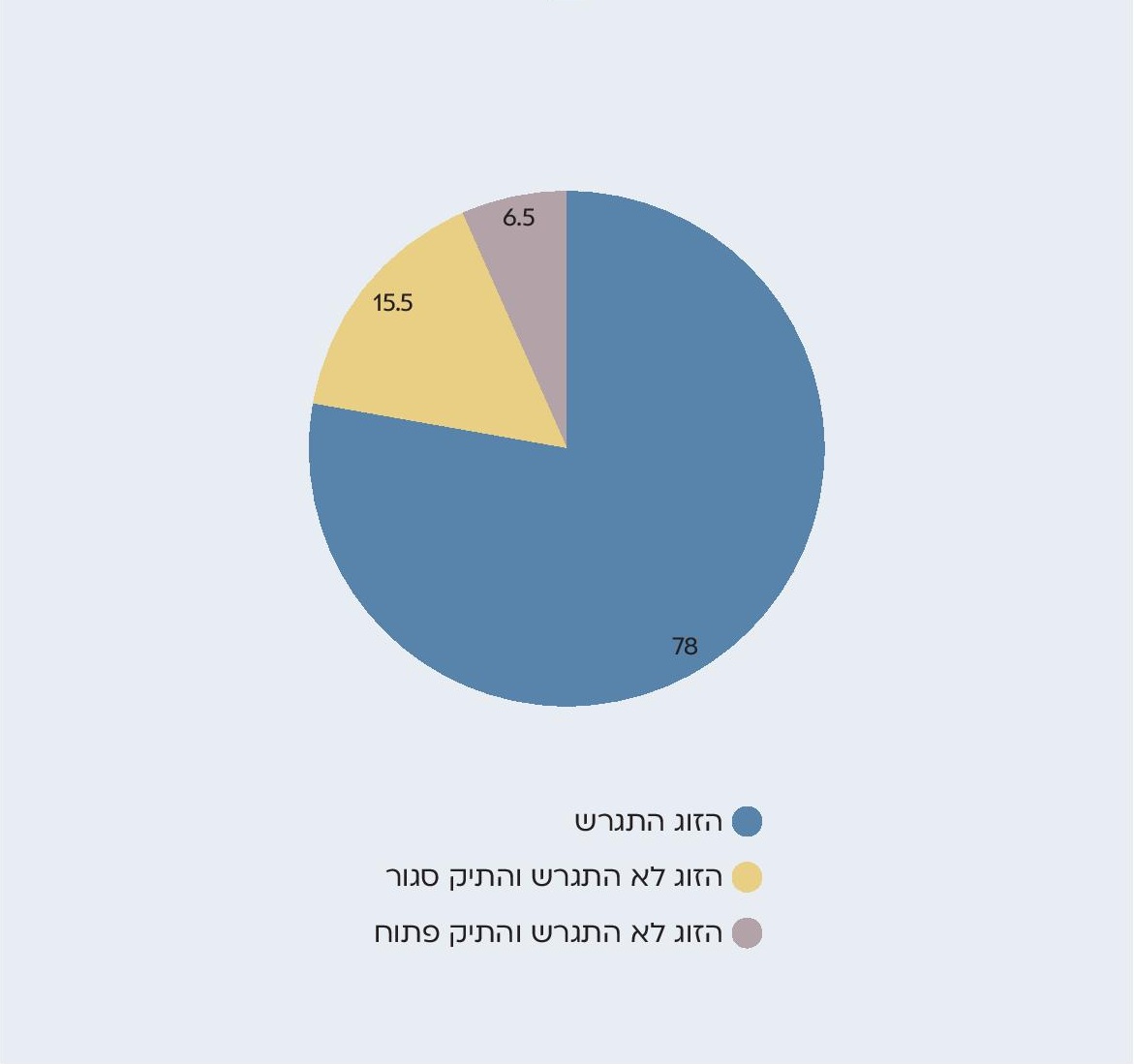המחלוקות בעניין מדיניות הגירושין בישראל נסבות בעיקר על תביעות הגירושין בבתי הדין הרבניים, שהן פרי סכסוך בין בני זוג, לכן בהן נתמקד בהמשך פרק זה. רוב תביעות הגירושין מסתיימות בגט, אך חלק מהן נסגרות ללא גט. עשויות להיות לכך סיבות אחדות: התובע חזר בו מהתביעה או שהזוג הגיע לשלום בית; בית הדין דחה את התביעה; התביעה נסגרה מינהלתית בשל חוסר פעילות בתיק במשך חצי שנה. בנתוני בתי הדין אין הבחנה לפי סיבות הסגירה. בתרשים הבא מוצגת התפלגות תיקי תביעות הגירושין לפי סטטוס הגירושין של הזוג וסטטוס התיק.
