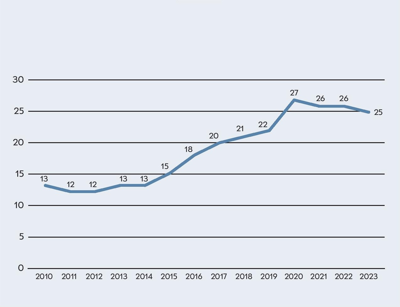 2014-2010 הוא עמד על 13%, ואילו בשנת 2020 הוא הגיע לשיא של 27%. על פי הנתונים הקיימים כרגע, בשנת 2023 שיעור התיקים שניתן בהם פסק דין ירד, אבל כיוון שפסקי דין ניתנים לעיתים גם לאחר יותר משנה מפתיחת התיק, סביר להניח כי המספרים יעודכנו לאחור ויעלו, ומגמת הירידה אינה צפויה להימשך.
