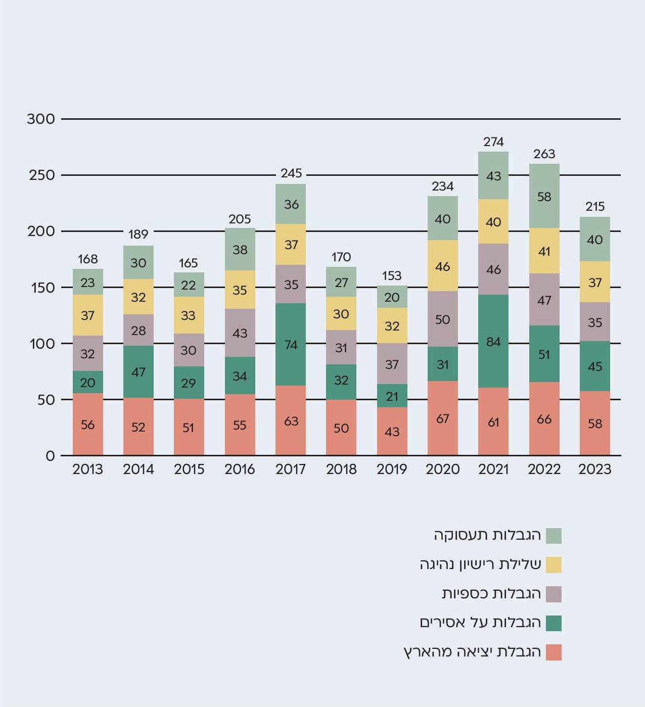 תרשים ג/9. צווי הגבלה שהוטלו בתיקי תביעת גירושין בבתי הדין הרבניים, לפי סוג ההגבלה, 2023-2013 (במספרים מוחלטים)