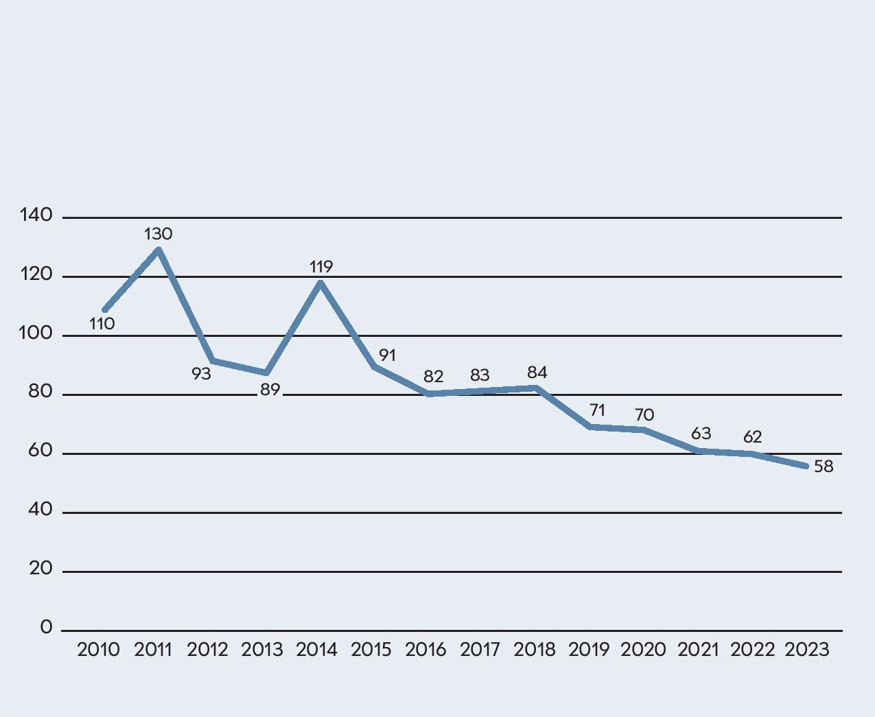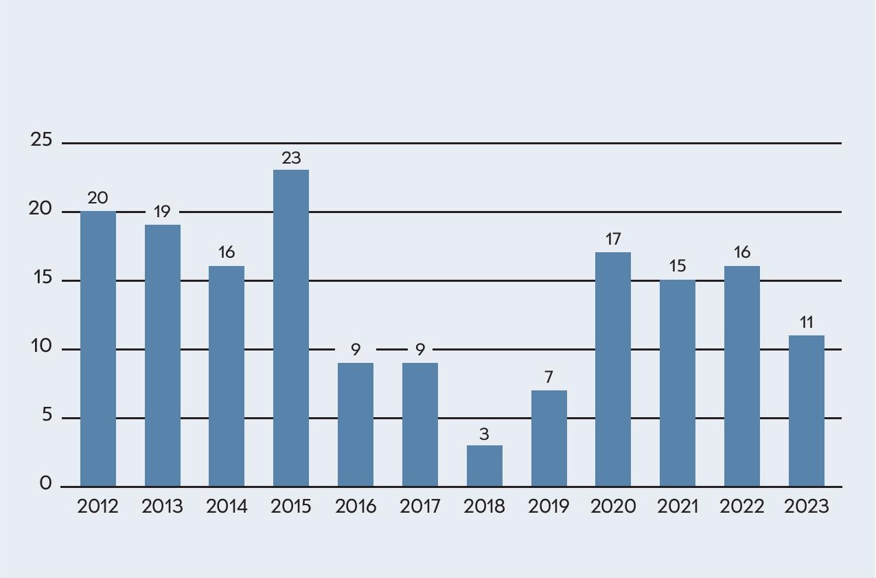תרשים ג/10. צווי מאסר נגד סרבני גט, 2023-2012 (במספרים מוחלטים)