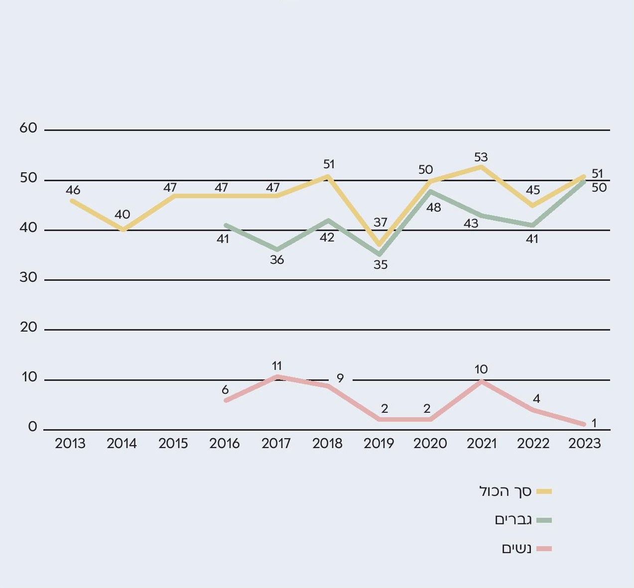 * הנתונים בנושא זה זמינים רק לפי שנת פתיחת התיק, מכיוון שפסק דין יכול להינתן גם בשנים שלאחר שנפתח התיק, לא ניתן להציג נתונים מדויקים לגבי מספר התיקים בהם ניתן פסק דין בשנה מסוימת.