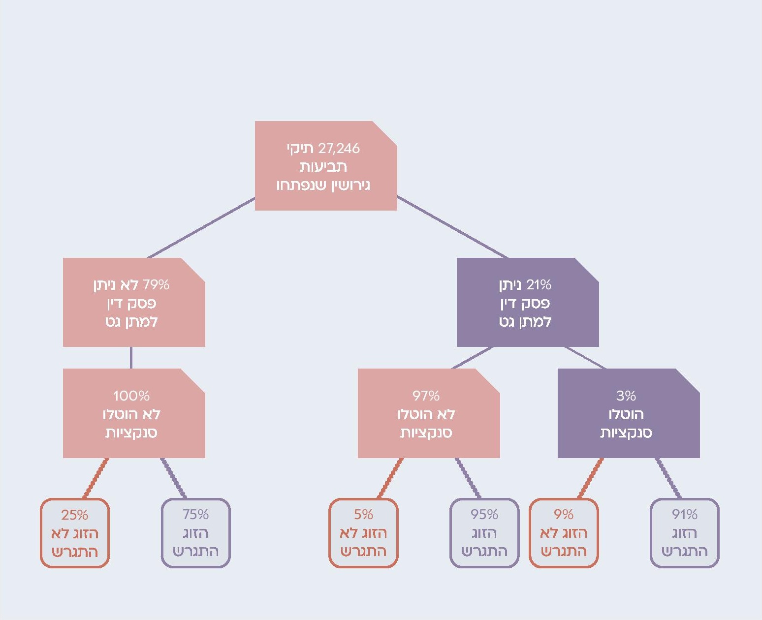 באשר לתיקים שניתן בהם פסק דין למתן גט אך לא הוטלו סנקציות, נמצא שב־95% מהמקרים הזוג התגרש, וב־5%, שהם 264 תיקים, הזוג לא התגרש. תיקים אלו, שבהם ניתן פסק דין למתן גט אך הזוג לא התגרש גם כעבור כמה שנים, הם תיקים שיש בהם פוטנציאל משמעותי להטלת סנקציות.