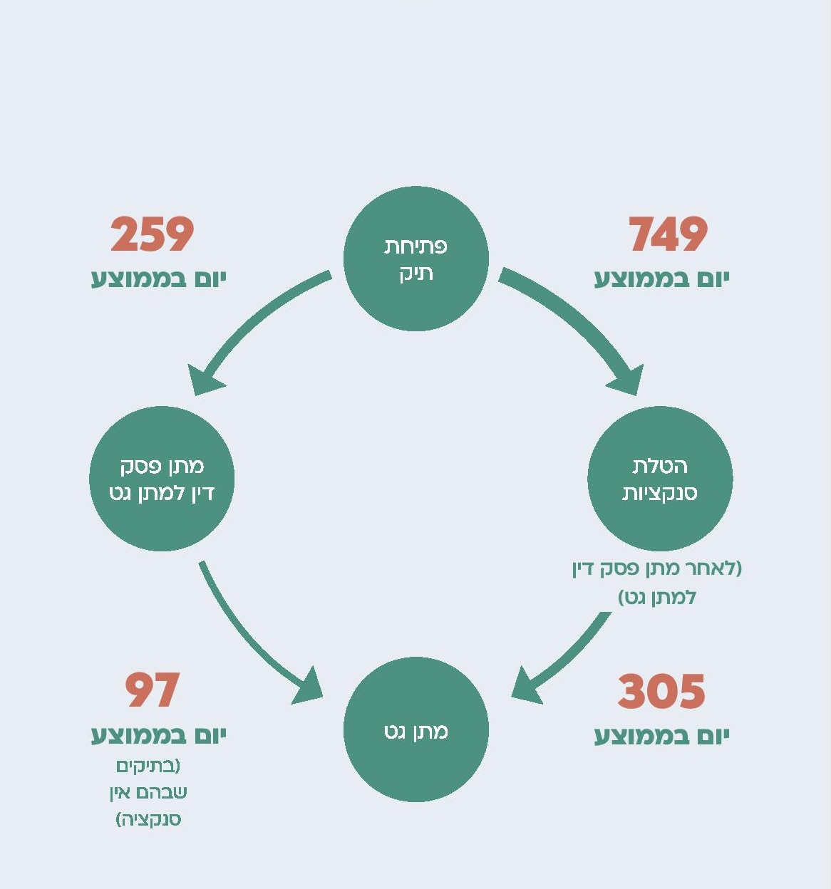 לעומת זאת, הטלת סנקציות היא תהליך ארוך הרבה יותר. בתיקים שבהם הוטלו סנקציות נמצא כי הסנקציה הראשונה בתיק ניתנה בממוצע 749 ימים, מעט יותר משנתיים, לאחר הגשת התביעה. נוסף על כך, בתיקים שבהם לאחר הסנקציה ניתן גט נמצא כי עברו בממוצע 305 ימים, מעט פחות משנה, בין הטלת הסנקציה הראשונה למתן הגט.הנתונים בנוגע לכל החלטה נבחנו בנפרד. כך למשל, מספר הימים הממוצע מפתיחת התיק ועד פסק דין למתן גט חושב על פי כל התיקים שניתן בהם פסק דין למתן גט בשנים 2021-2018, ומספר הימים הממוצע ממתן פסק הדין למתן גט ועד להטלת הסנקציה חושב מתוך כלל התיקים שניתנו בהם סנקציות בשנים 2021-2018.