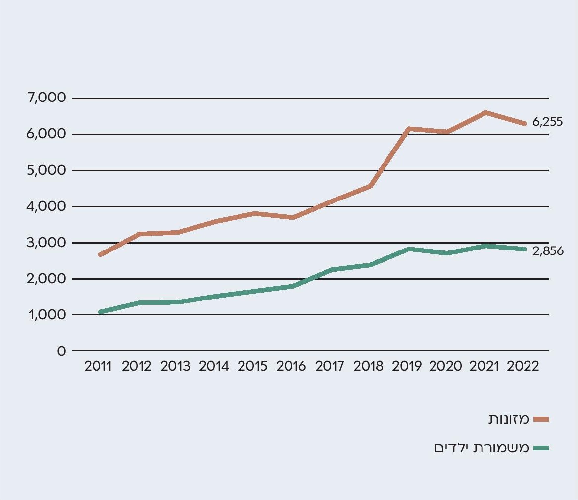 הנהלת בתי המשפט אינה מבחינה בין תיקי מזונות אישה לתיקי מזונות ילדים ומסווגת את שניהם כתיקי מזונות. נוסף על כך, בתי המשפט לענייני משפחה דנים גם בתיקי משמורת ילדים ובתיקי חלוקת רכוש. התרשים הבא מציג את מספר התיקים שנפתחו בכל שנה בבתי המשפט לענייני משפחה.