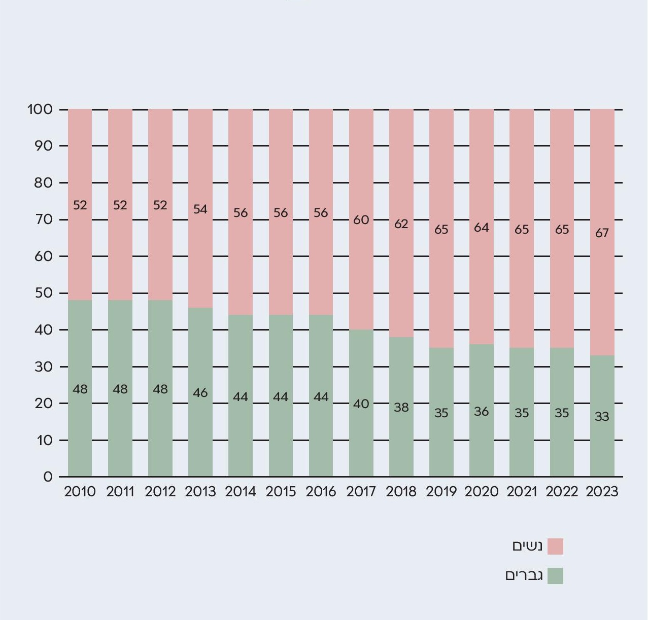 תרשים ג/18. תיקי תביעות גירושין בבתי הדין הרבניים לפי מין פותח התיק, 2023-2010 (ב־%)