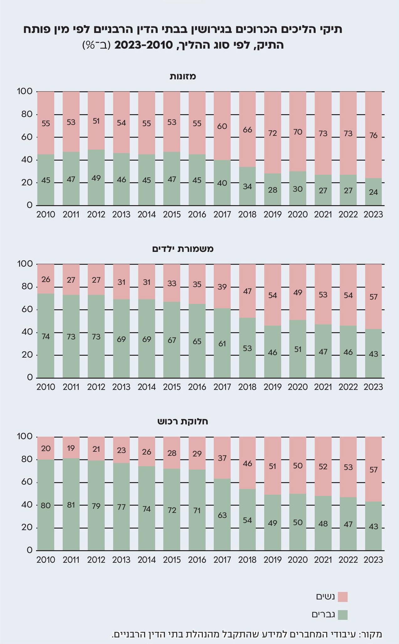 על אף הקשיים המתודולוגיים שהוזכרו, ניתן להצביע על שתי מגמות ברורות: ראשית, ישנה מגמת עלייה ניכרת בשיעור תיקי התביעה הנפתחים על ידי נשים בבתי הדין הרבניים בכלל ההליכים הכרוכים בגירושין, כך שמשנת 2019 מרבית התיקים שנפתחו היו על ידי נשים. מגמת הגידול בולטת במיוחד בתיקי חלוקת רכוש (מ־20% ל־57%) ובתיקי משמורת ילדים (מ־26% ל־57%). מגמת עלייה זו לאורך השנים גדולה בהרבה מהגידול בשיעור הנשים הפותחות תיקי תביעות גירושין (מ־52% ל־67%), כך שניתן לשער שהיא משקפת גם שינויים בהעדפות של נשים בכל הנוגע לפתיחה של תיקי הליכים הכרוכים בגירושין בבתי הדין הרבניים.