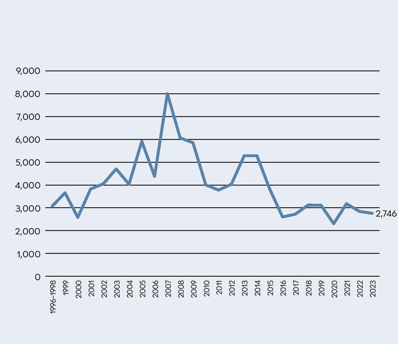 תרשים ה/1. מתגיירים במערכי הגיור הרשמיים, 2023-1996 (במספרים מוחלטים)