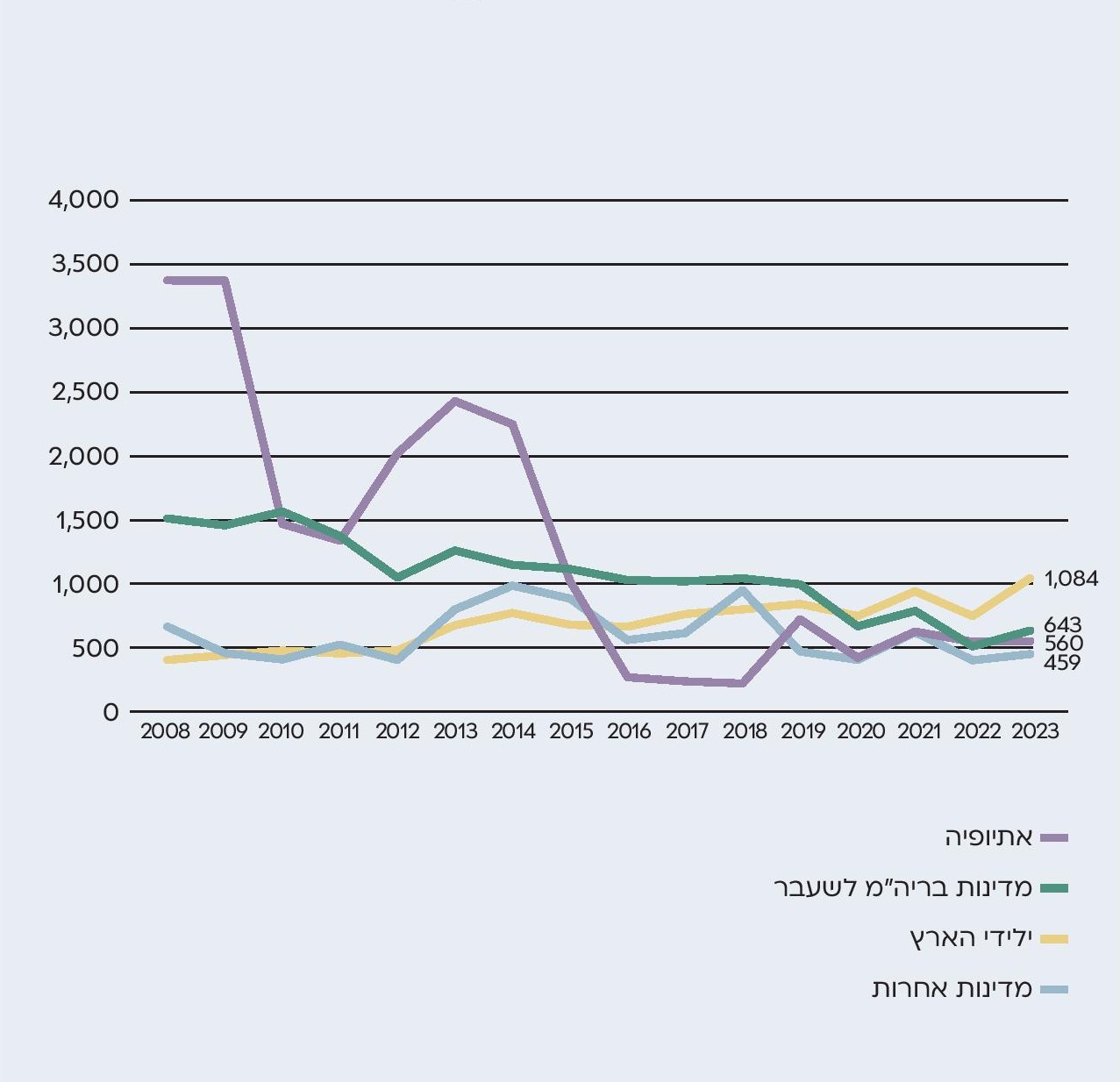 התרשים הבא מציג את מספר ואת שיעור המתגיירים הכללי בשנים 2023-2008 לפי ארץ הלידה שלהם.